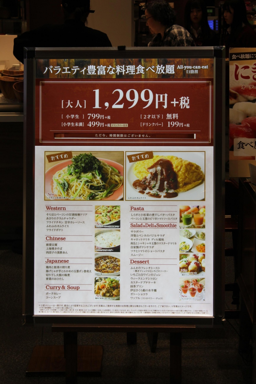 イオン発寒店1階のレストラン街にある食べ放題のレストランで、1人1,300円+税とリーズナブルで時間制限もありません。