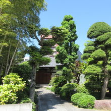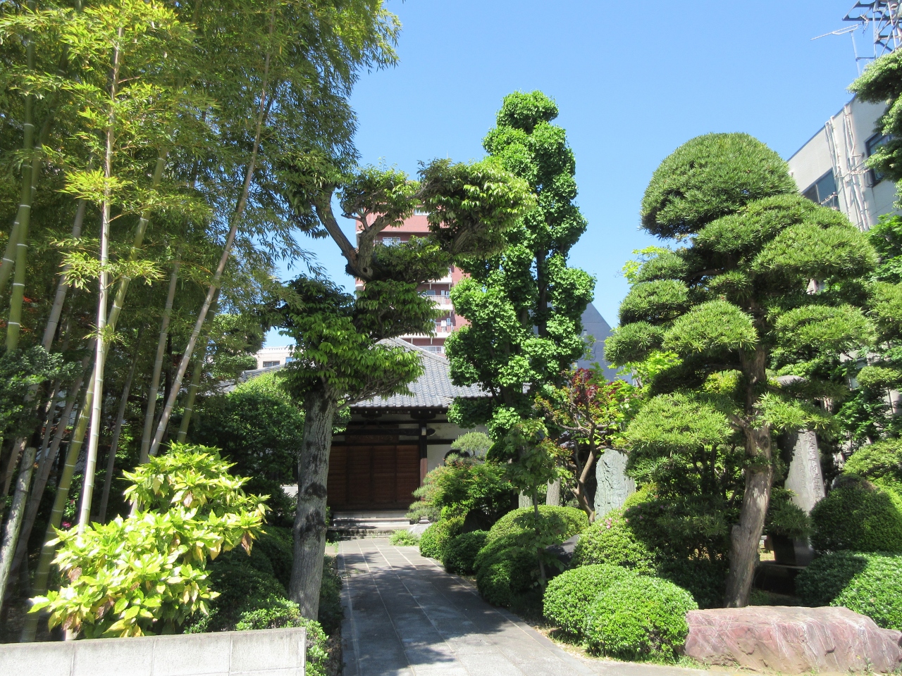 浅草通り、松ケ谷1丁目交差点から100mほど、左衛門橋通り沿いに建つ真言宗の寺院です。境内には竹林が造られ、手入れが行き届いた松やモミジ、高さがある木々などが植えられ、小さな日本庭園のようでした。草木の中には石のテーブルと椅子が置かれ、休憩場所も造られていました。陽を浴びた新緑が美しく輝いているのが印象的でした。