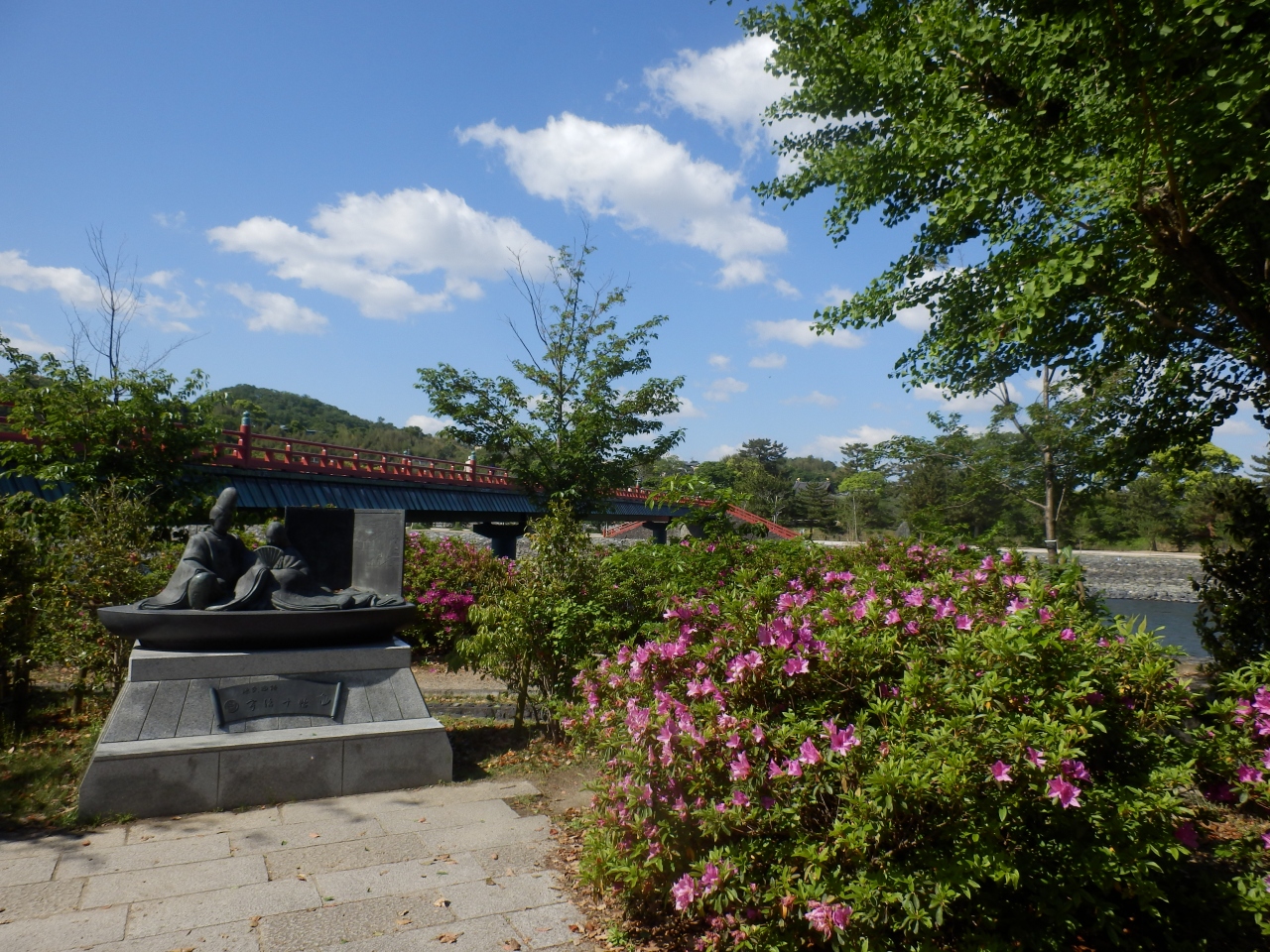 宇治神社参道を下った川縁に小さな広場があり宇治川で恋に陥った匂宮と浮舟のモニュメントが建っています。ここから平等院へ向かう為すぐ後ろに架かる朝霧橋を渡ります、