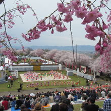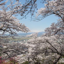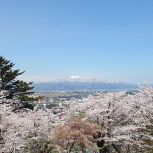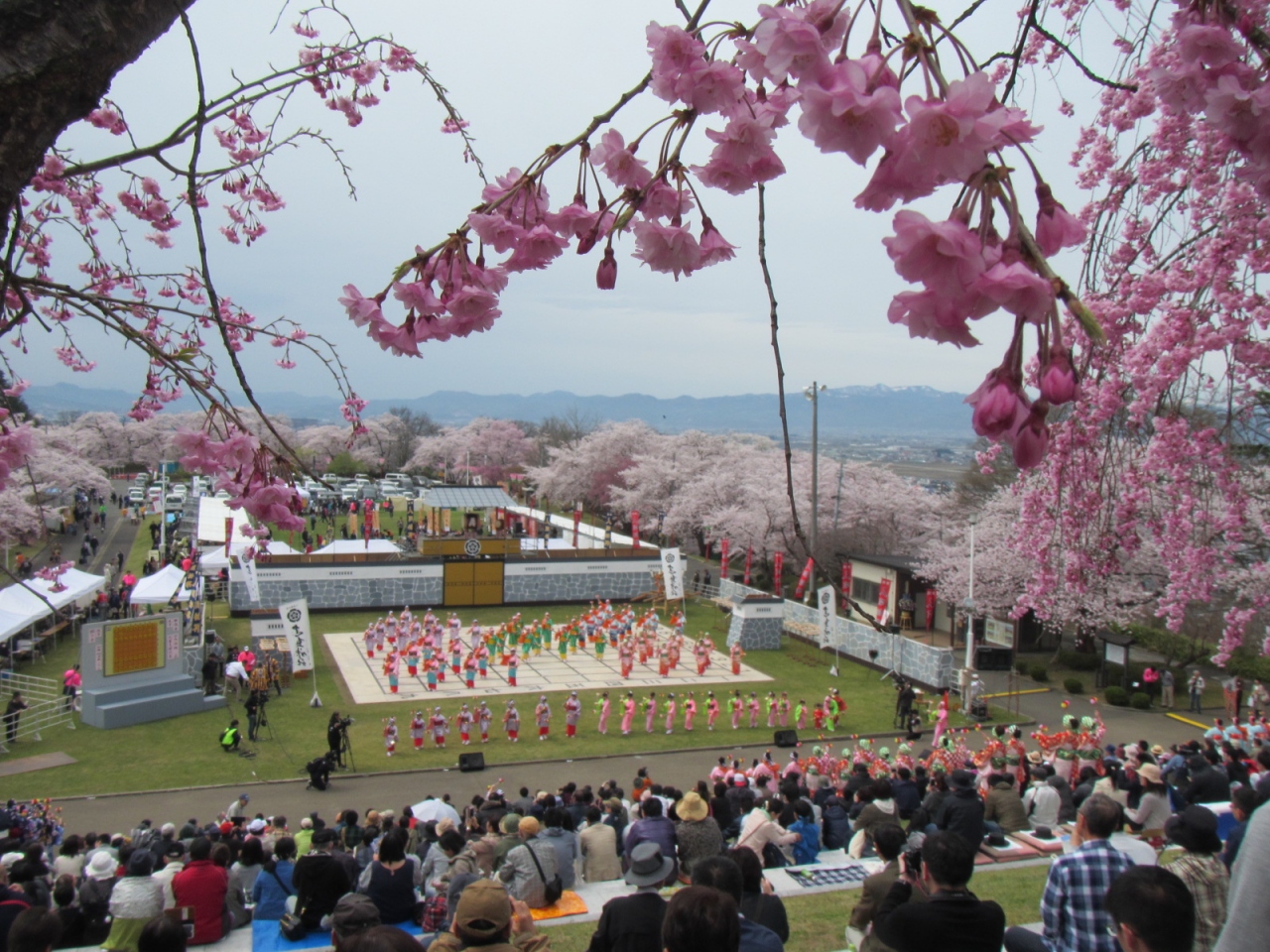 標高約240メートルの舞鶴山山頂までの公園で、山頂の広場は、山形盆地中部~北部が先の方まで見渡せる絶好のロケーションである。4月20日前後(4月中旬後半から下旬前半)には、桜が満開となり、頂上部は埋め尽くさんばかりの桜に覆われるので、ぜひ、この時期に訪れることをおススメしたい。山頂の広場では、毎年この時期に「天童さくらまつり」が開かれ、広い盤面で行われる人間将棋は名物となっている。将棋のことは分からなくても、食べ物を売る出店もあって、祭りの賑やかな雰囲気や満開の桜は、将棋ファンならずとも、十二分に楽しめるものである。そばの無料配布なども行われていた。