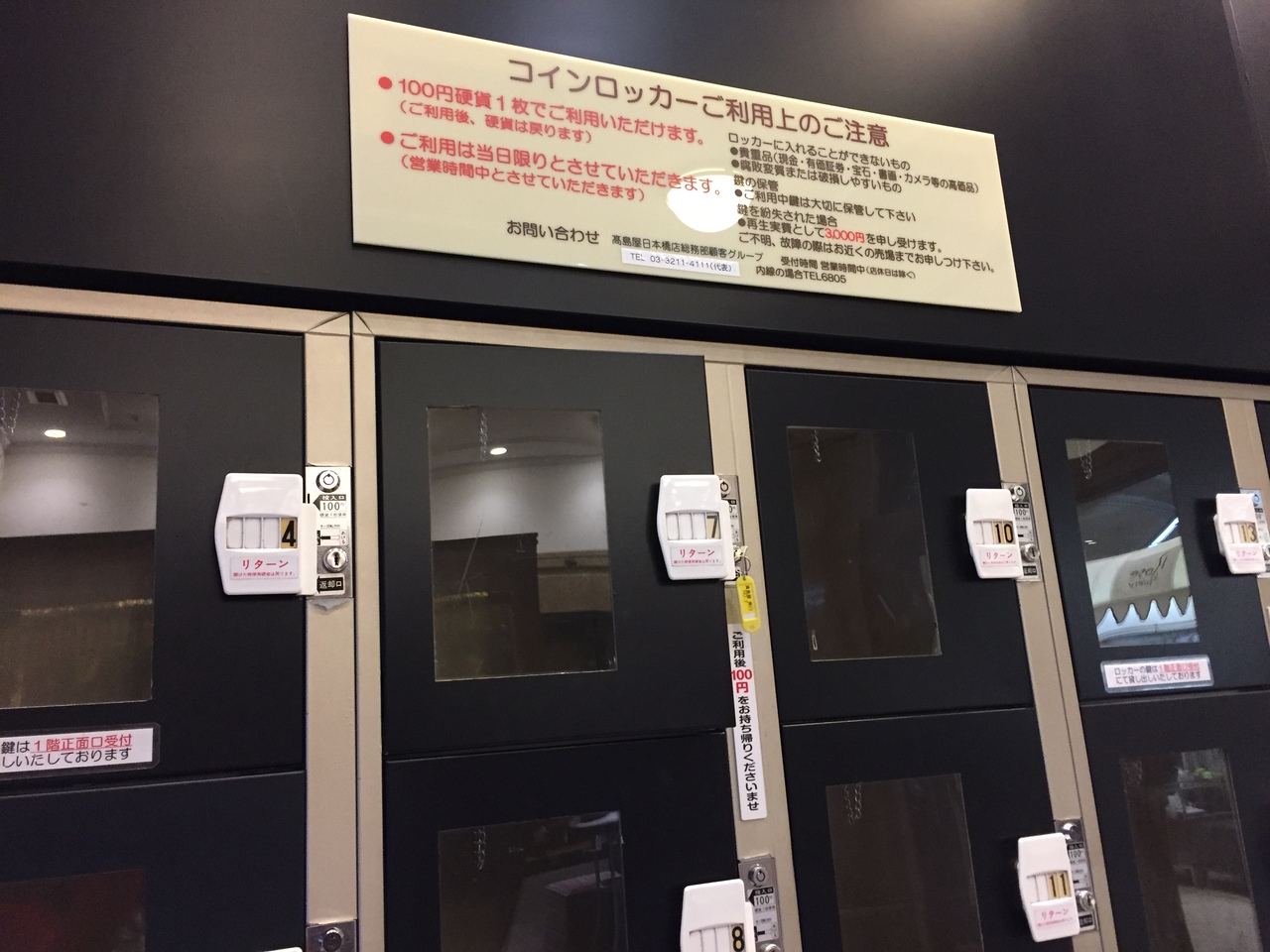 本館1階の入ったところ(エルメスの裏側?というのでしょうか お花屋さんのあたりです)コインロッカーがあり、荷物が多い日はこちらに入れて、館内でお買い物すると便利ですね。返却式のコインロッカーですので、百円玉は返却されます。