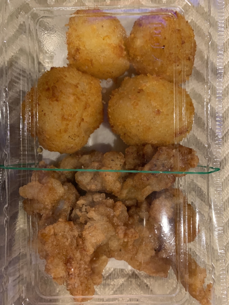 週末の夜に夜ご飯を購入しにグランディ用のお惣菜コーナーをうろうろしていたら、こちらのお店でお得なパックがあるよと言っていただいたので思わず購入しました。こちらの唐揚げは好みなのでお得な買い物ができてうれしかったです。ポテトもホクホクしている感じで普通に美味しかったです。