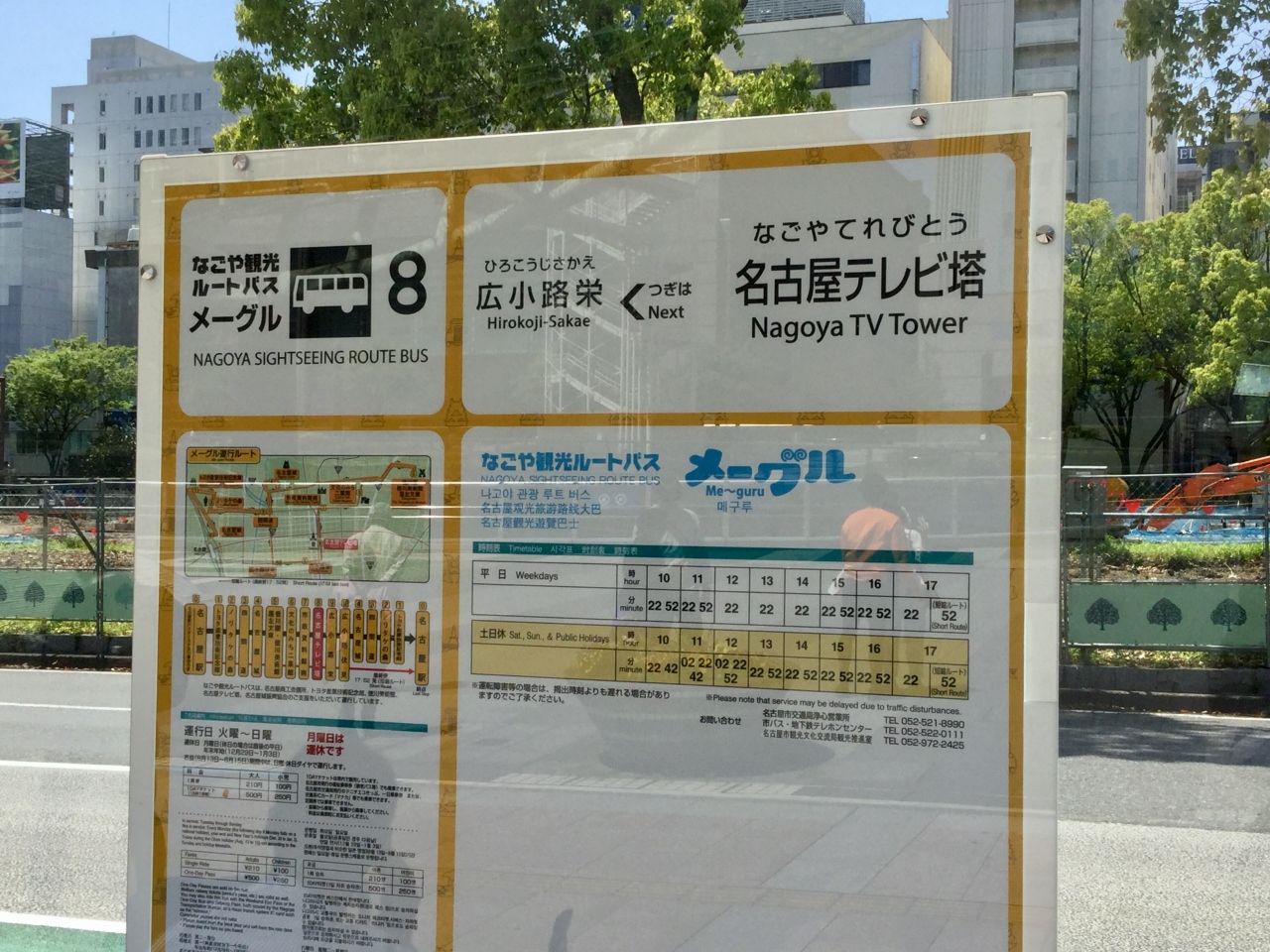 宿泊先のホテルで貰ったフリーガイドでメーグルの存在を知り、土日と休日(土曜・日曜・休日ダイヤ特別運行日含む)および毎月8日(環境保全の日)に限り、市バス・地下鉄全線で利用可能の「ドニチエコきっぷ」という1日券を名古屋の地下鉄窓口で購入し、メーグルで利用してみました。