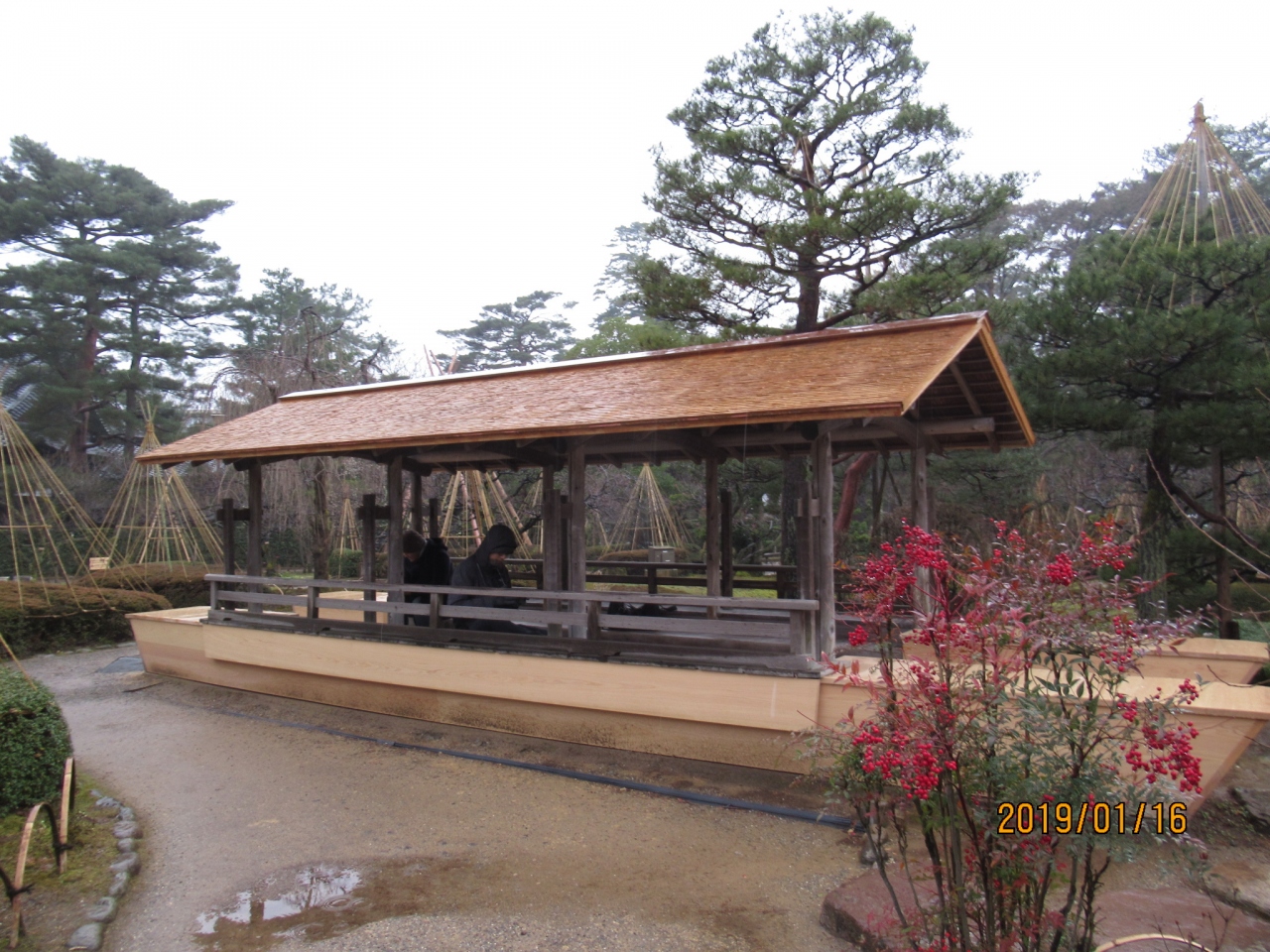 梅林の西寄りの流れ沿いにあり、梅を眺める船の形をしたユニークな東屋のようです。