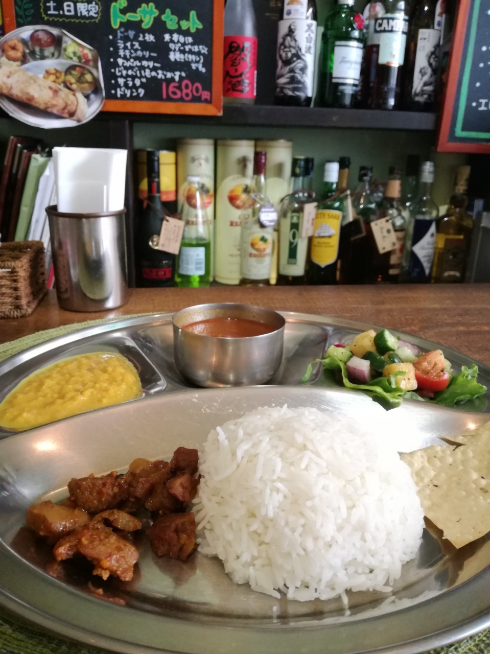 スリランカンプレートを注文。ライス・お肉・カレー2種・サラダなどがひとつのプレートに入って来ます。カレーは辛口と甘口と2種。本場のスリランカ料理は食べたことがありませんが、本場の味がする!そんな雰囲気でした。