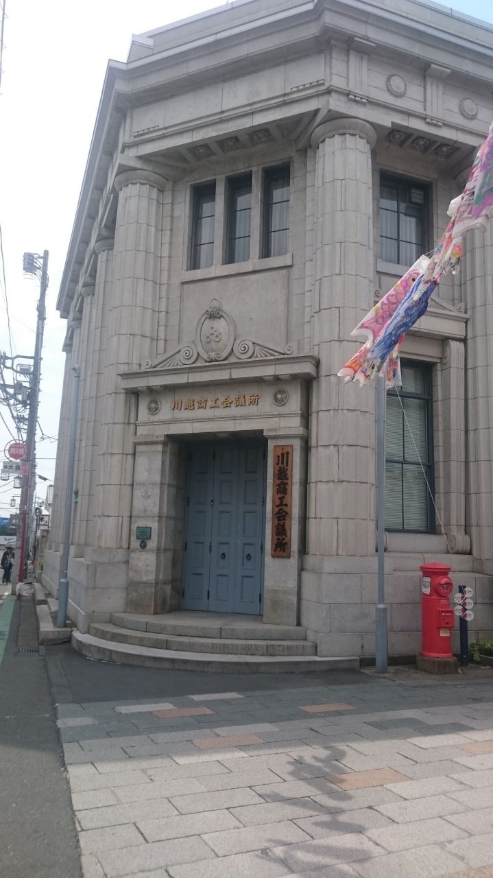 クレアモール商店街から大正浪漫夢通りの突き当たりまで行くと川越商工会議所の建物があります。国指定有形文化財で神殿みたいな建物です。昭和3年(1928年)に武州銀行川越支店として建てられ、現在は川越商工会議所てして使用されています。