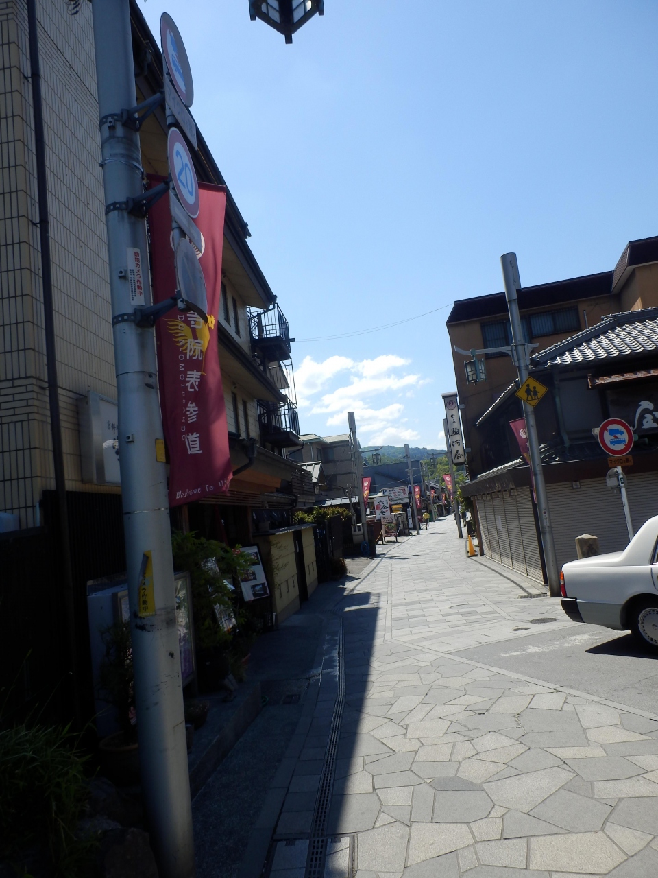 宇治橋の西詰からすぐ左折すると幅6M程の道両側にお茶の販売、カフェ、古美術店、料理店などが並び門前町が形成されています、宇治の名産はお茶なのでお茶関連の店が目立ちます、通り抜けると宇治の平等院表門があります、古くからのお店が多く佇まいに奥ゆかしさを感じました