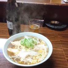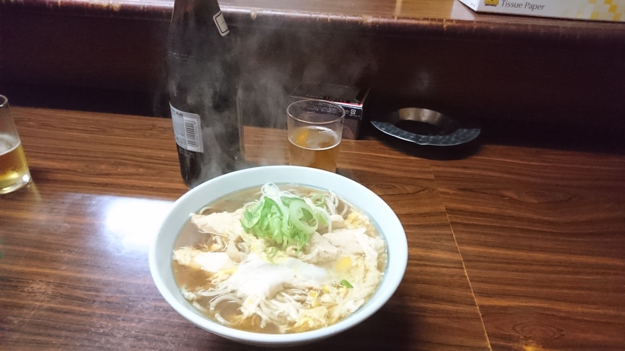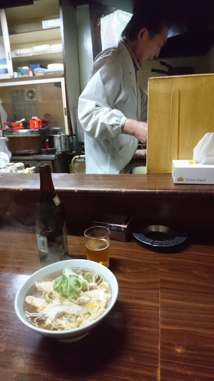 釧路で友人と飲み歩いて最後に行ったお店です。炉ばた2軒と寿司屋1軒、スナック1軒の帰りです。お腹はいっぱい。しかし、どうしても汁物が欲しくなったので、こちらお店に入りました。入ったときは、客は2人しかいなかったのに、その後、続々と来て満員に。人気店です。私は、親子そばを注文。親父さんが一人で切り盛りしていますが、手早く親子そばが出てきました。味は、駅の立ち食いソバのような味です。少し甘めの汁に、茹でたそば。汁には、鶏の出汁が出ていておいしくいただきました。飲んだ後でも、不思議と汁まで飲み干しました。