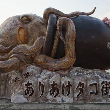 ありあけたこ街道沿いに道の駅があります。ここは18時に閉館しますが、そこに車を駐車して歩道橋をわたり、海沿いに行くとタコの像が2体あります。タコは幸運の使者と言われており写真スポットになっています。像の前にはカメラスタンドもあるので便利です。