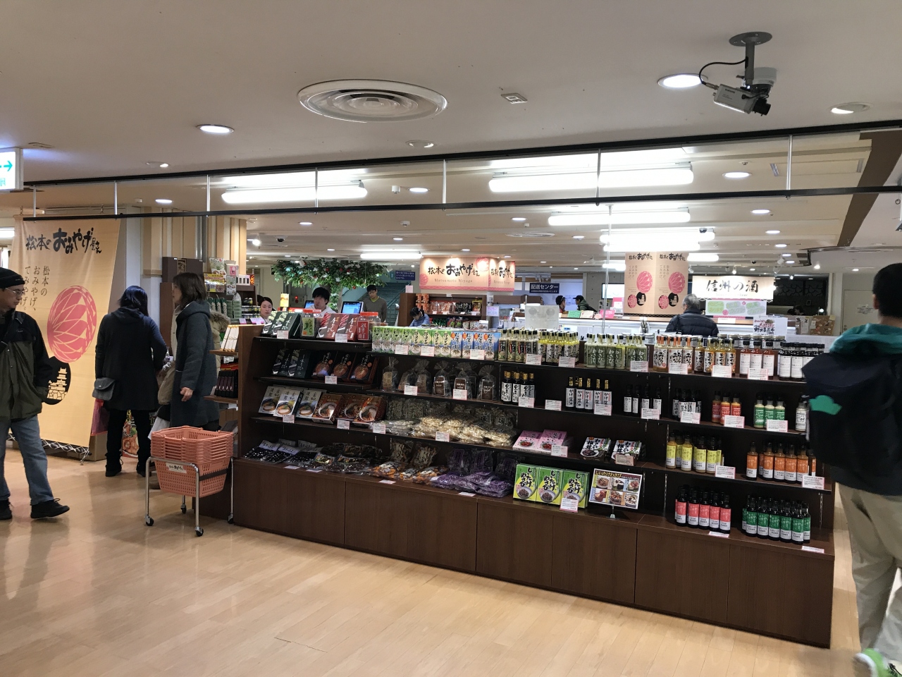 松本バスターミナルの中にはいろいろなお店が入っていますが、地下一階にの土産屋さんのおかげで買い忘れた品を手身入れることができました。お酒から食品までいろいろな商品がそろっていますので、電車やバスの発車前にちょっとした買い物ができました。