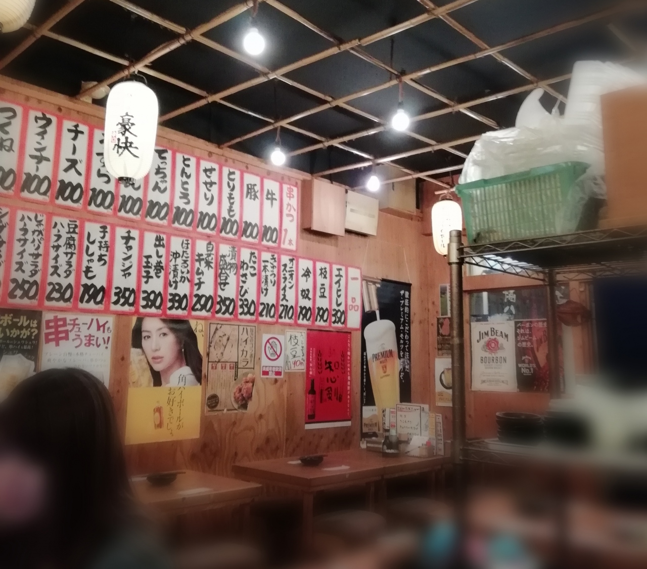 JR天満駅から徒歩3分ほど、裏天満通りにある居酒屋の満マルです。初めて見る看板ですがインパクトがあり、よく目立ちます。大衆酒場の雰囲気で気に入ったので即入店。串カツは100円~、その他つまみも200円台~300円台とリーズナブル。店員も元気がありオススメの居酒屋です、是非。