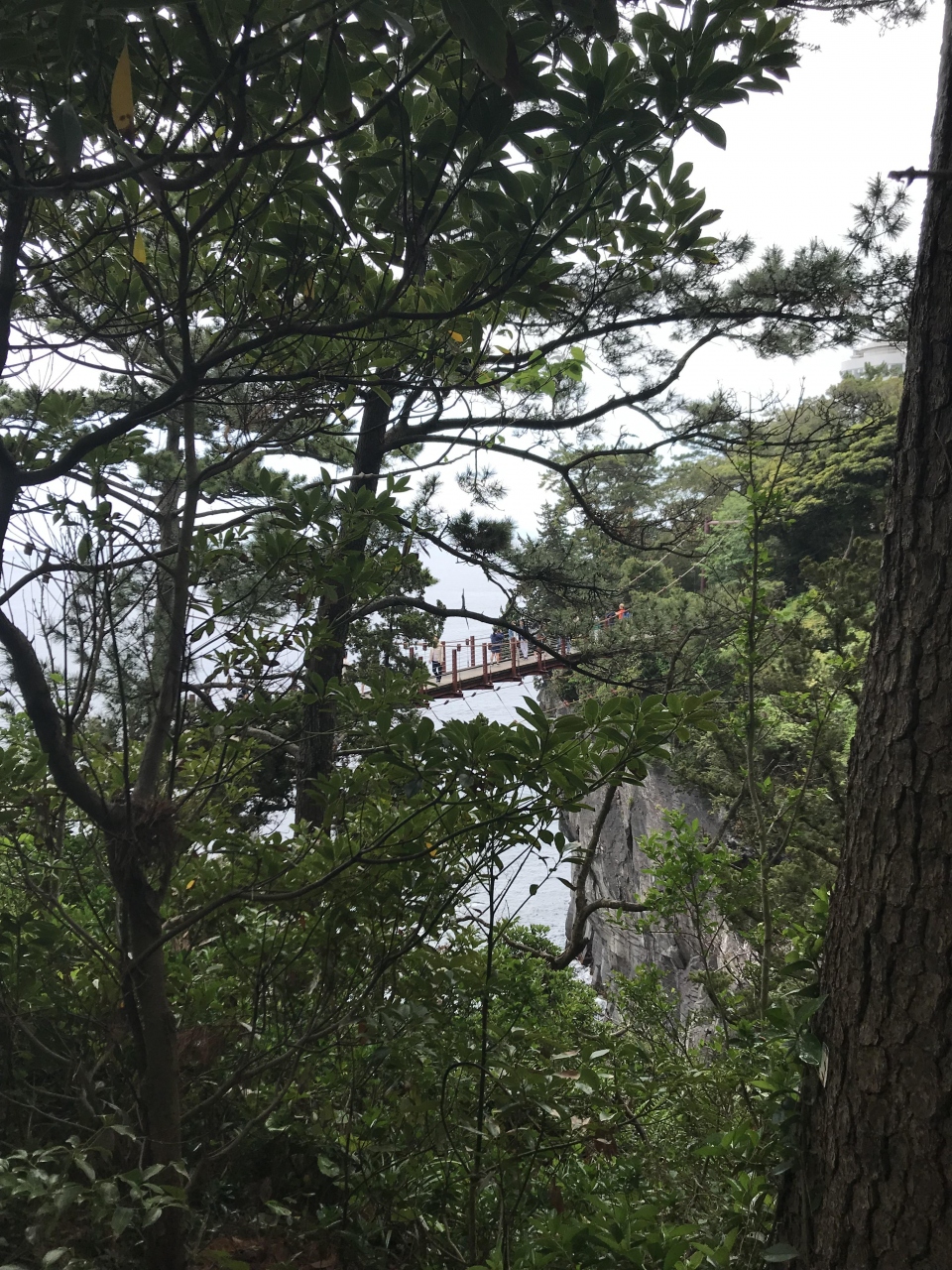 有料駐車場から3分くらいのところにあります。途中にトイレもあります。駐車場の方からは、奥に灯台が見えるので、そちらに向かう途中に吊り橋があります。かなり揺れるので、怖がっている人も多かったです。真下の水はかなり奇麗でした。