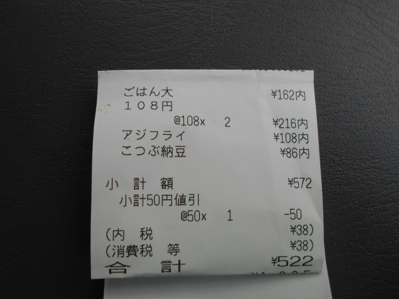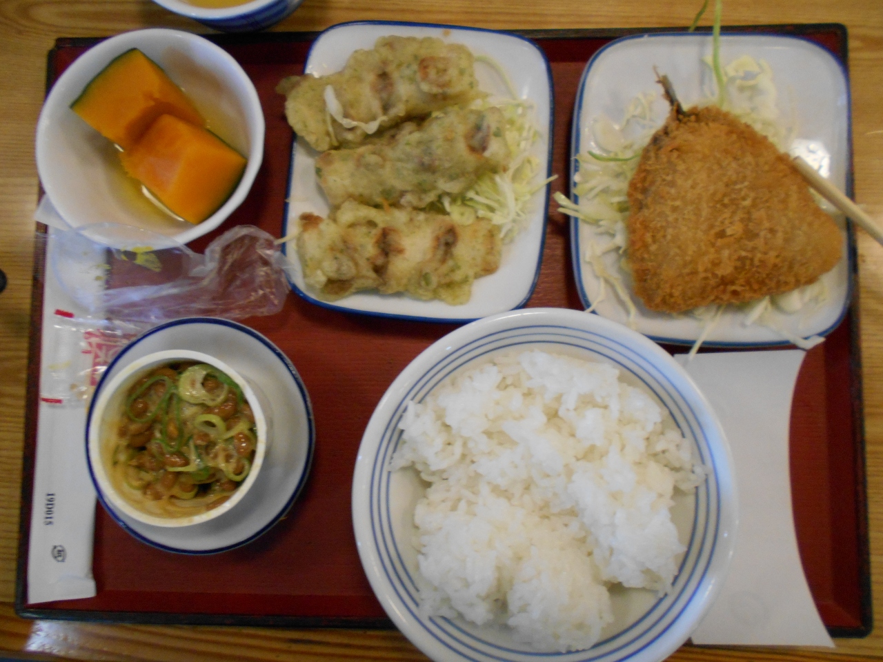 追手門大学の入口近くにある食堂です。自家用車がないとバスしか交通手段はありません。サービス品が100円であります。わたしは竹輪の磯辺揚げにしました。アジフライも100円です。これにかぼちゃ(100円)と納豆をつけてみました。ごはんは大でも値段は変わりません。これで600円しません。おまけに50円引きのクーポンもあります。健康的な昼食でしょう。
