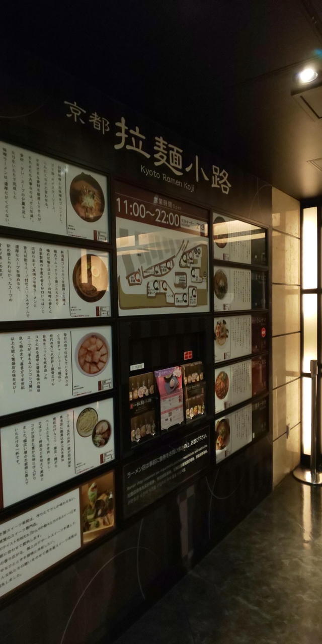 京都駅直結、伊勢丹脇エレベーターを使って10階に上ったところにある京都拉麺小路です。京都のラーメン店以外にも、新潟、富山、札幌等9都市の人気ラーメン店が入店しています。お店はすべて、21:30ラストオーダーです。