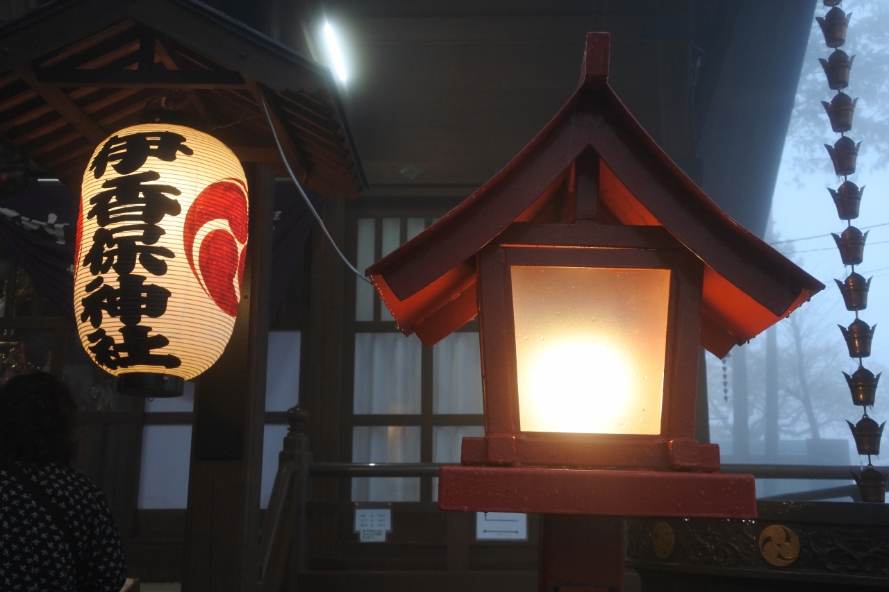 伊香保石段街のてっぺんにありました。石段の一番下から365段で到着です。あいにくの雨の夕方、靄っていて、なんとも言えない雰囲気です。参拝者も多くはないです。