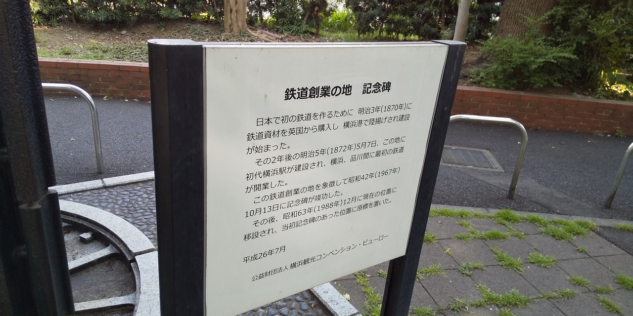 桜木町駅近く、京浜東北線の高架下に鉄道発祥の記念碑があります。ちょっと分かりにくい場所で、地下街の桜木町ぴおシティの1番出口を出た目の前です。