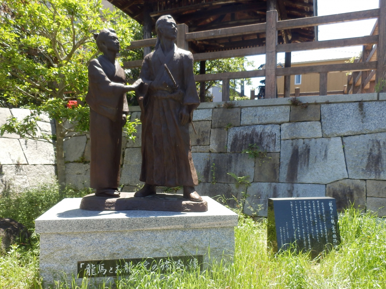 寺小屋事件後龍馬とお龍は伏見の寺田屋浜から薩摩へと旅立つ、伏見の寺田屋に宿泊していた龍馬は伏見奉行所の役人に囲まれて危機一髪で脱出、寺田屋前の浜から薩摩へお龍と共に旅立つ物語、史実であるようだが公園の像からは伺えない、元気てね、行ってらっしゃいとうような雰囲気ではなかったはず、役人の逮捕から逃れるのも旅立ちの目的であったと推定されます、寺田屋側からですと濠川に架かる京橋を渡るとすぐ左の階段を下ると小さな公園がありその中に設置されていました