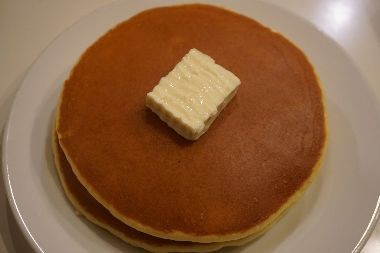 気になっていたホットケーキ600円をいただきました。特別なおいしさはないように思いましたが、バターとシロップがほどよい味わいだし、フォークとナイフにもちょっと感心。大きさも適当に鋭いナイフも、これがベストといった感じの使い良さ。試行錯誤で辿り着いた形なんだと思います。