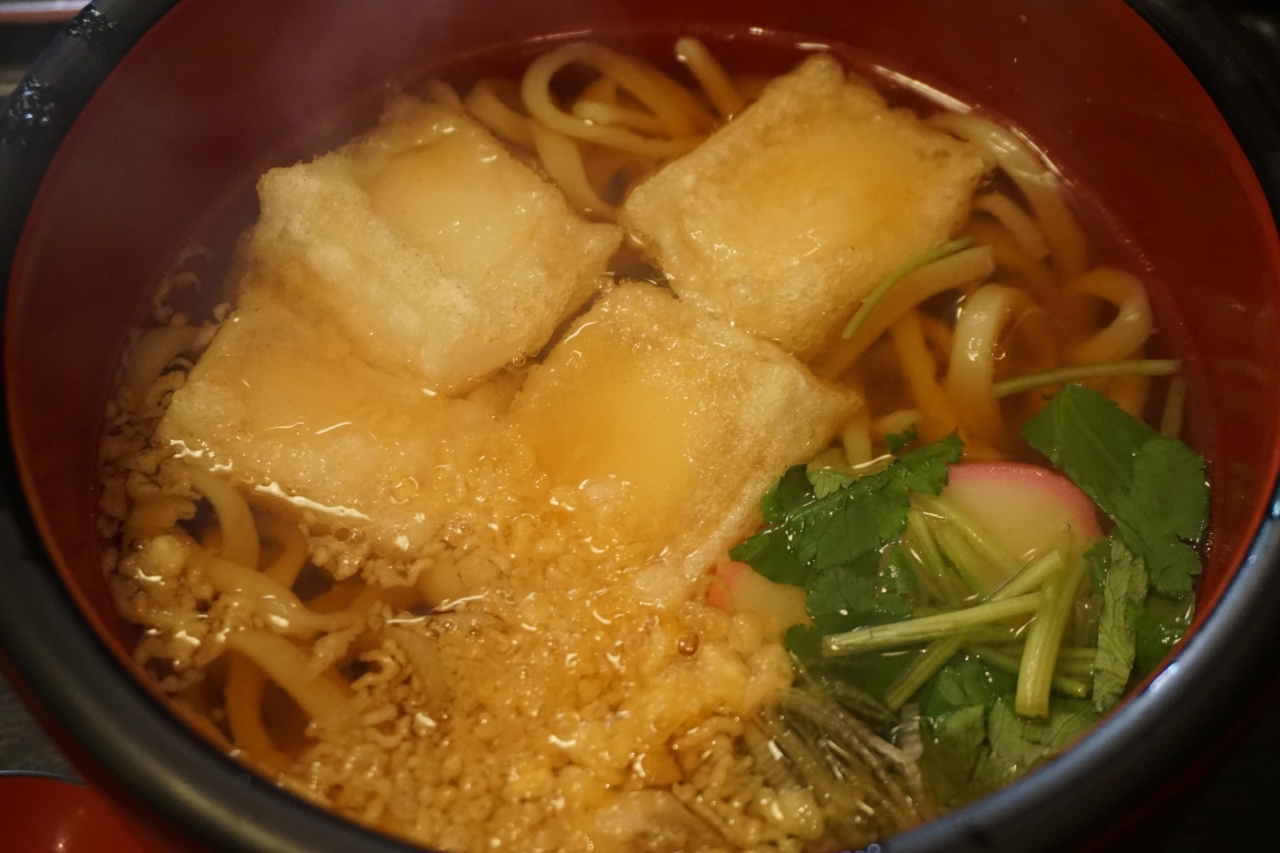 オレンジ通りにある家康うどん。あまり目立たない店構えなんですが、今回は試しに寄ってみました。いただいたのは、力うどん。うーん、このスープは鰹節の出汁ですが、いい味出してますねえ。うどんはコシがあるのですが、細めに仕上げているので、これならつるつるいただけます。お餅の方も四つしっかり入っていて、ボリューム感もある。全体としてバランスのいいうどん。なかなかの名店です。