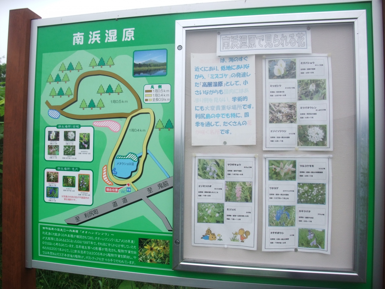 南浜湿原にはメヌウショロ沼がある。メヌウショロ沼はオタトマリ沼ほど大きくはないが、沼の北に広がる南浜湿原は利尻島最大の湿原で、ミズバショウやワタスゲなどが群生している。 南浜湿原は自然いっぱいだが、オタトマリ沼ほど観光客は多くない。この小さな沼と湿原は静で私好みだ。