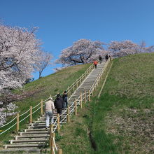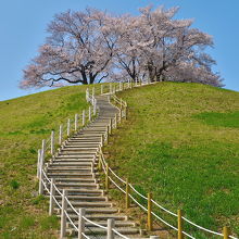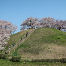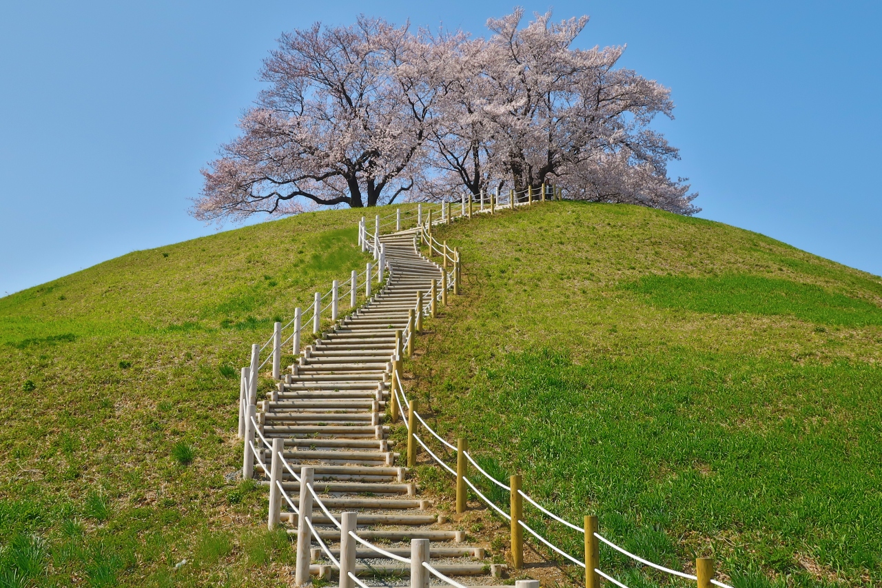 青空にそびえ立つ丘(古墳)の上に咲き誇る桜の花の姿は正にフォトジェニック。下から見上げるアングルがとっても良く、絵になる風景に出会えます。