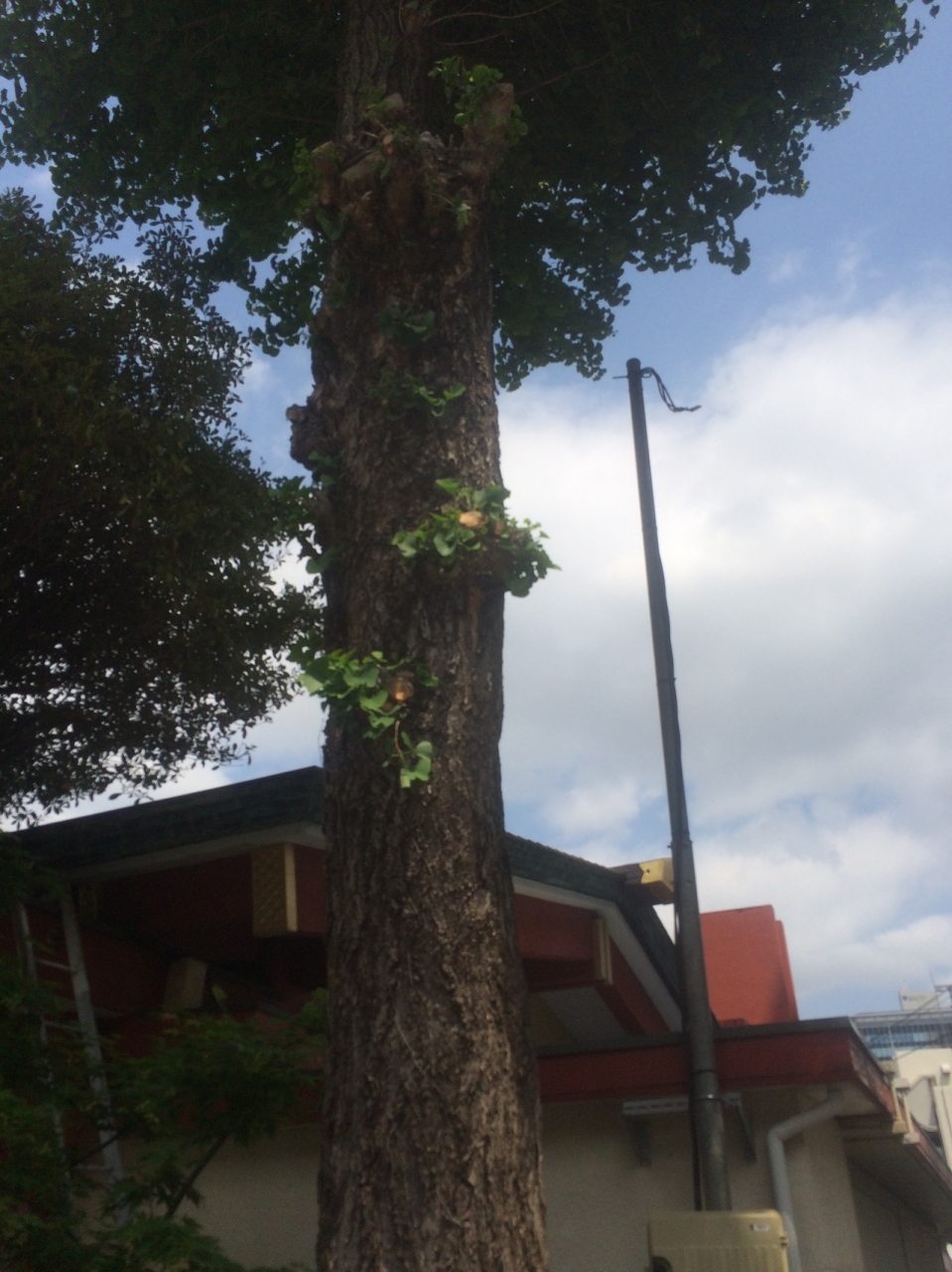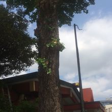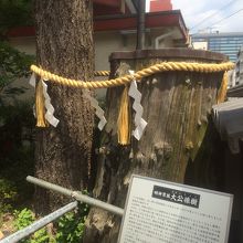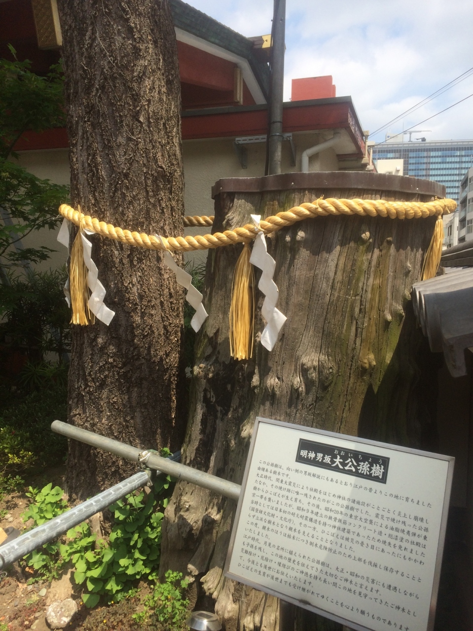 男坂を降りる横にあり太さはないですが高い木で、すぐ横には木を切った木がありしめ縄で結ばれています。江戸時代から、この他にある木で関東大震災でも残った木です。一見何処にでもあるような木でしたが由緒ある木でした。