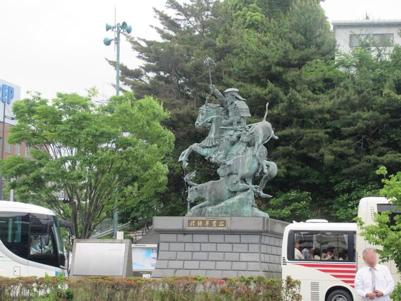 小田原駅西口を出たところに立つ北条早雲像です。小田原城を治めた戦国大名北条氏の祖として知られています。