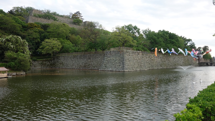 丸亀市の南部に位置する亀山を中心に建つ城で、荒々しい野面積みと端整な算木積みの土台から、頂は垂直になるよう独特の反りを持たせた石垣で有名。山麓から山頂まで4重に重ねられ、合わせると60メートルになり、総高としては日本一高い。