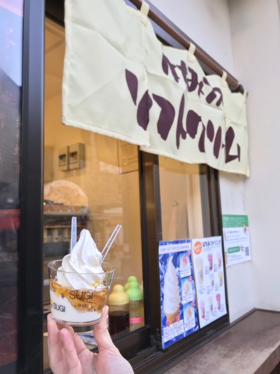 有名なハチミツソフトをいただきました。ソフトそのものにハチミツが練りこんであり、ソフトだけの商品やハチミツを使ったフルーツソースをかけた商品もありました。すべて320円でした。甘味は強いですが、さっぱりとしていて食べやすかったです。