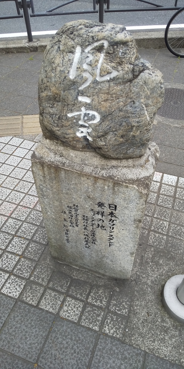 よくよく見ないと通過してしまいそうな、そんな小さな碑は、この地が日本のガソリンスタンドの始まりの地だそうです。