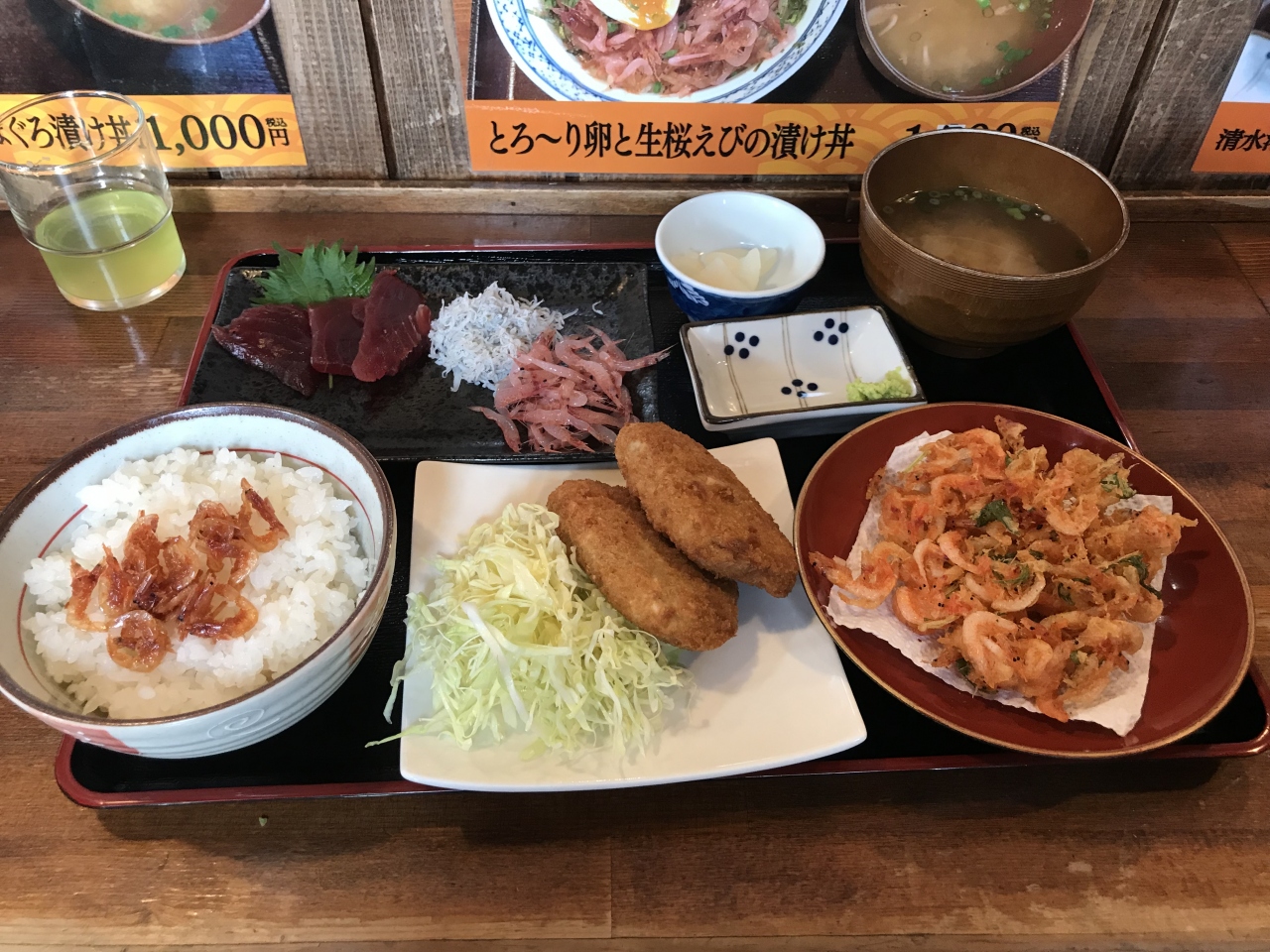 桜えびのかき揚げはサクサクで香ばしい!テーブルに置いてあるえび塩をかけるとさらに旨さアップ!黒はんぺんフライもホクホク。さらに生の桜えびと釜揚げしらす、ミナミマグロの刺身がついてなかなか楽しめます。生の桜えびも甘くて意外にウマイ。(しらすは生より釜揚げ派)マグロも旨味が濃い感じで、由比の味を堪能でき、満足。