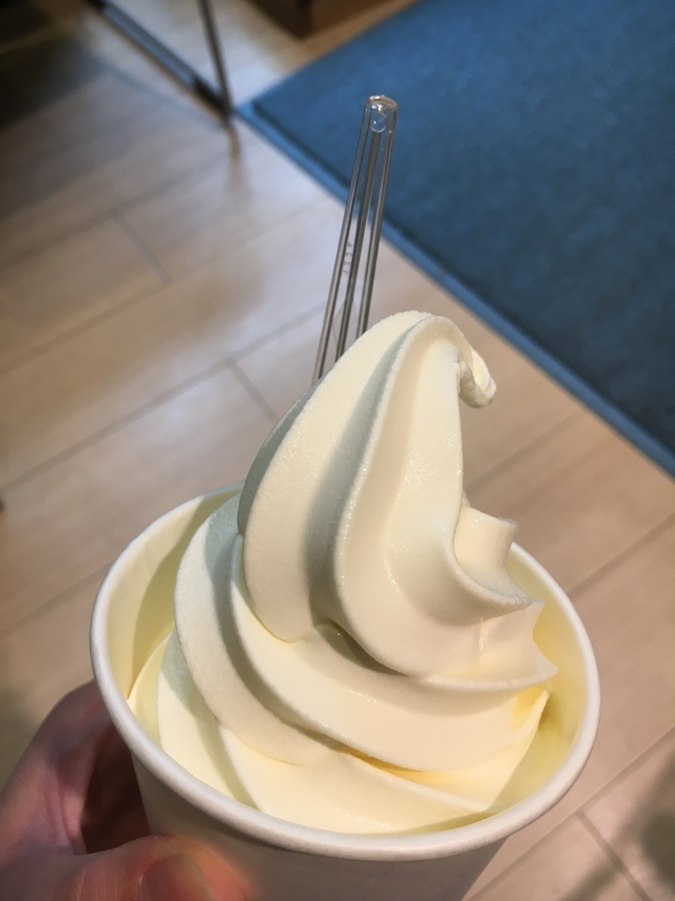 小岩井農場のソフトクリームをいただきました。Mサイズ¥300で、量はたっぷりあります。少しチーズような風味も感じる濃厚なソフトクリームで大変美味しかったです。今回は予定の途中で立ち寄りましたが、次はトロイカのベイクドチーズケーキを購入しに行きたいと思います。