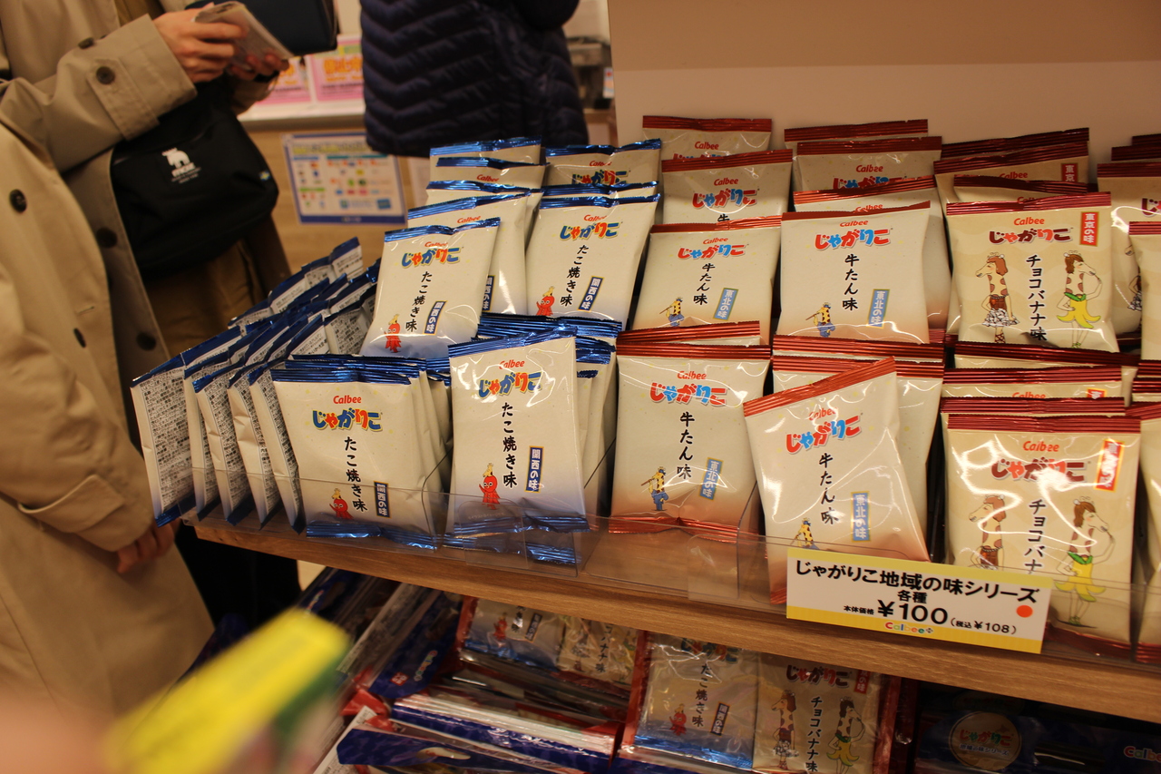 北海道札幌市にあるすすきの地区狸小路商店街の中にありました。カルビーとキットカットのオフィシャルショップです。店内ではぽてりこやネスレのコーヒーがいただけます。ショップではご当地じゃがりこがあり大阪のたこ焼き、仙台の牛たんなど100円の小分けパックで買えるのでいろんな味を楽しめました