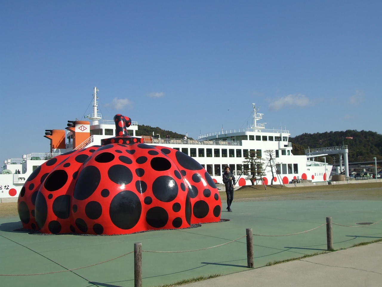 直島の玄関口、宮浦港フェリー乗り場の近くにあり、フェリーからも見えます。直島といえば赤カボチャというくらい代表的な観光スポットなので観光客が多く、ゆっくり写真を撮ったり中に入って遊んだりするには朝の早い時間に訪れるのがいいかも。