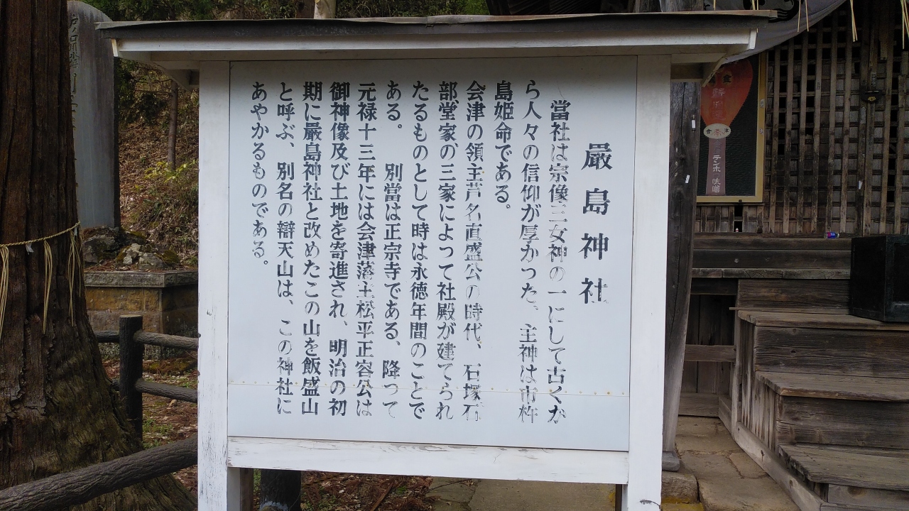 厳島神社の創建は室町時代初期の永徳年間に、石塚、石部、堂家家の3家が宗像三女神である市杵島姫命の分霊を勧請し社殿を建立したのが始まりと伝えられ、当初は宗像神社と称し飯盛山も辯天山と呼ばれました。神仏習合していた事で祭神である市杵島姫命は弁才天と習合し、別当には正宗寺があたり歴代の領主からも信仰され地の有力者の崇敬社となり社運も隆盛し、特に会津藩(藩庁:鶴ヶ城)三代藩主松平正容が篤く帰依し、江戸時代中期に社領や御神像の寄進、社殿の造営などを行っています。 寛政8年には別当である正宗寺の三匝堂(さざえ堂)が建立されるなど隆盛を極めましたが明治時代初頭に発令された神仏分離令により正宗寺が廃寺となり境内にあった仁王門や大仏等は廃止され社号を「厳島神社」に改名しているそうです。飯盛山の帰り口にも鳥居があり戸ノ口堰水まで続いており第二鳥居は朱色で綺麗でした。