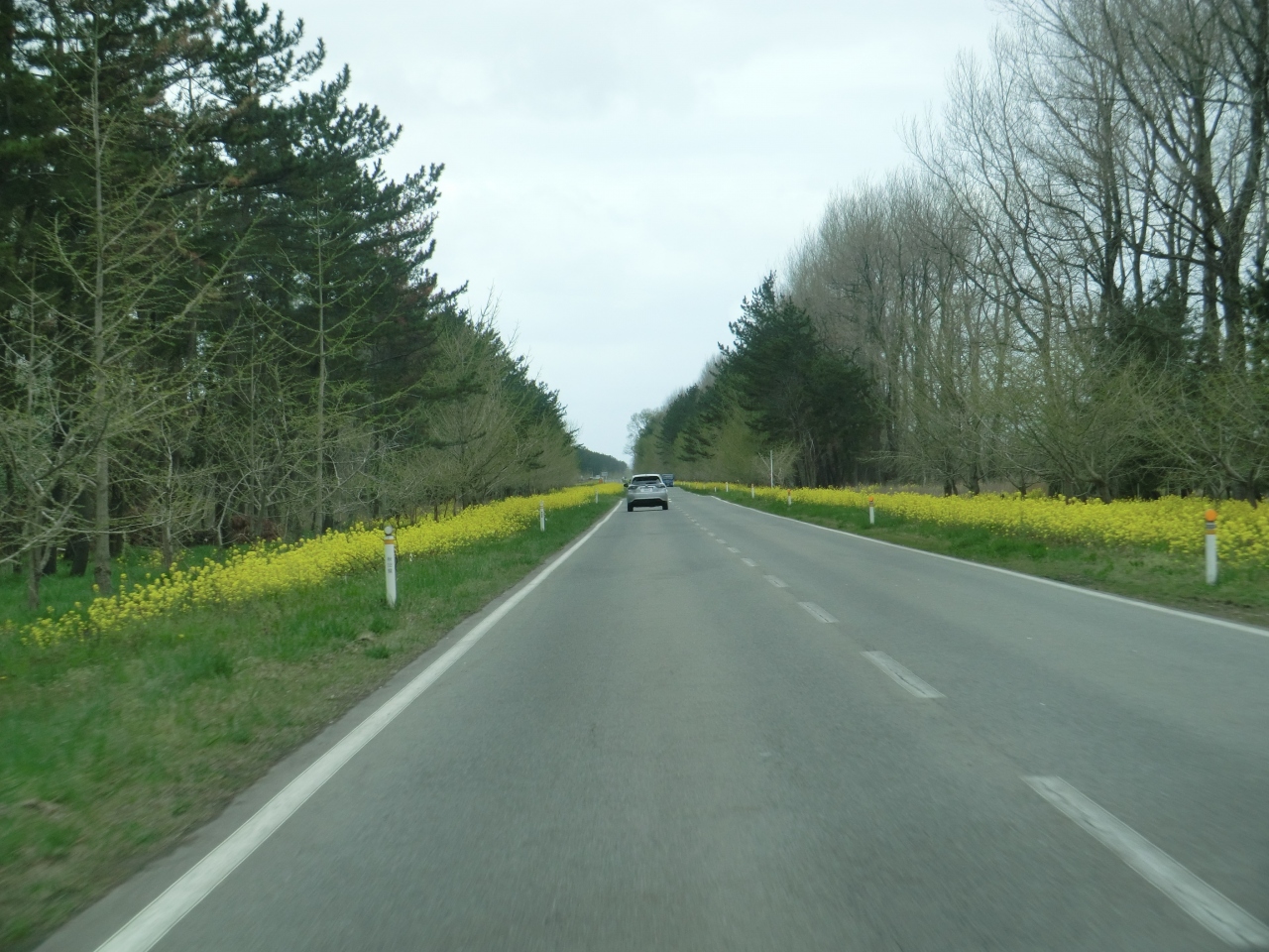 車で走りながら、両脇に咲く菜の花とその向こうに立つ低い桜の木。