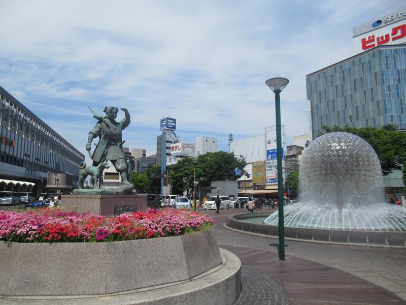 写真を撮りたくなる像ですが、撮る角度によって背景が変わるのでついつい何枚も撮りたくなってしまいます。駅ビルの駅名表示を背景にしたり隣の噴水を背景にしたり等々。