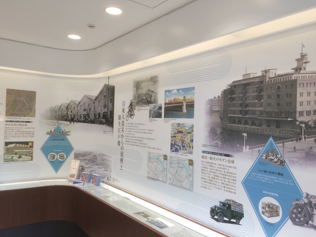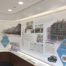 江戸川に隣接したビルで、各企業が入居しています。1階には待合コーナーがあり、椅子もありました。昔の日本橋やビルを紹介したコーナーがあり、模型もありました。内容、展示共によく出来ていてミニ博物館のようでした。