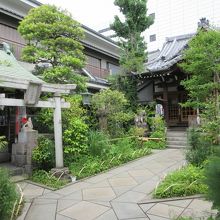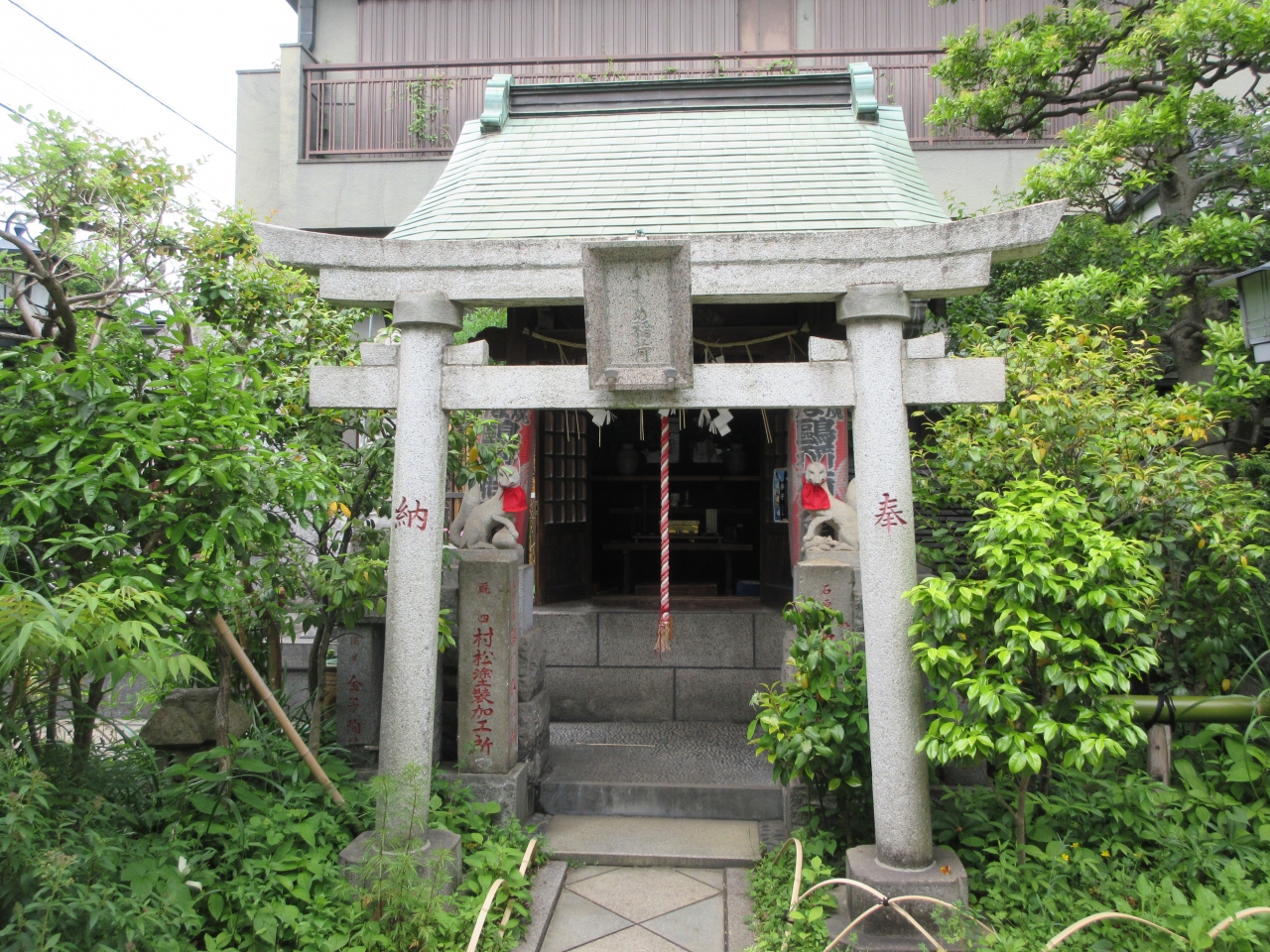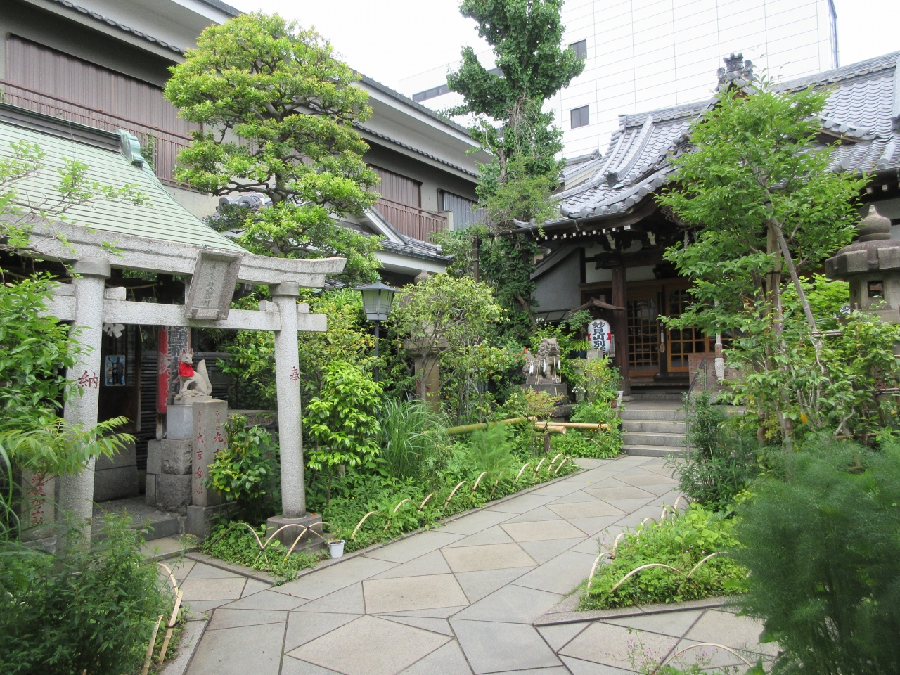 山門の先左に石造りの鳥居がありキツネが1対祠を守っています。木造銅板葺屋根の祠の中にガラス扉があり奥に鷗稲荷大明神が祀られています。年に1度授与される能勢の黒札は魔除けの黒札として有名です。日蓮宗寺院の境内に何故鳥居があるのか不思議でした。後で調べると大阪の能勢妙見山にも鳥居があるので東京別院に稲荷大明神が祀られているのも分かるような気がします。大切にされている祠に一層興味を持ちました。