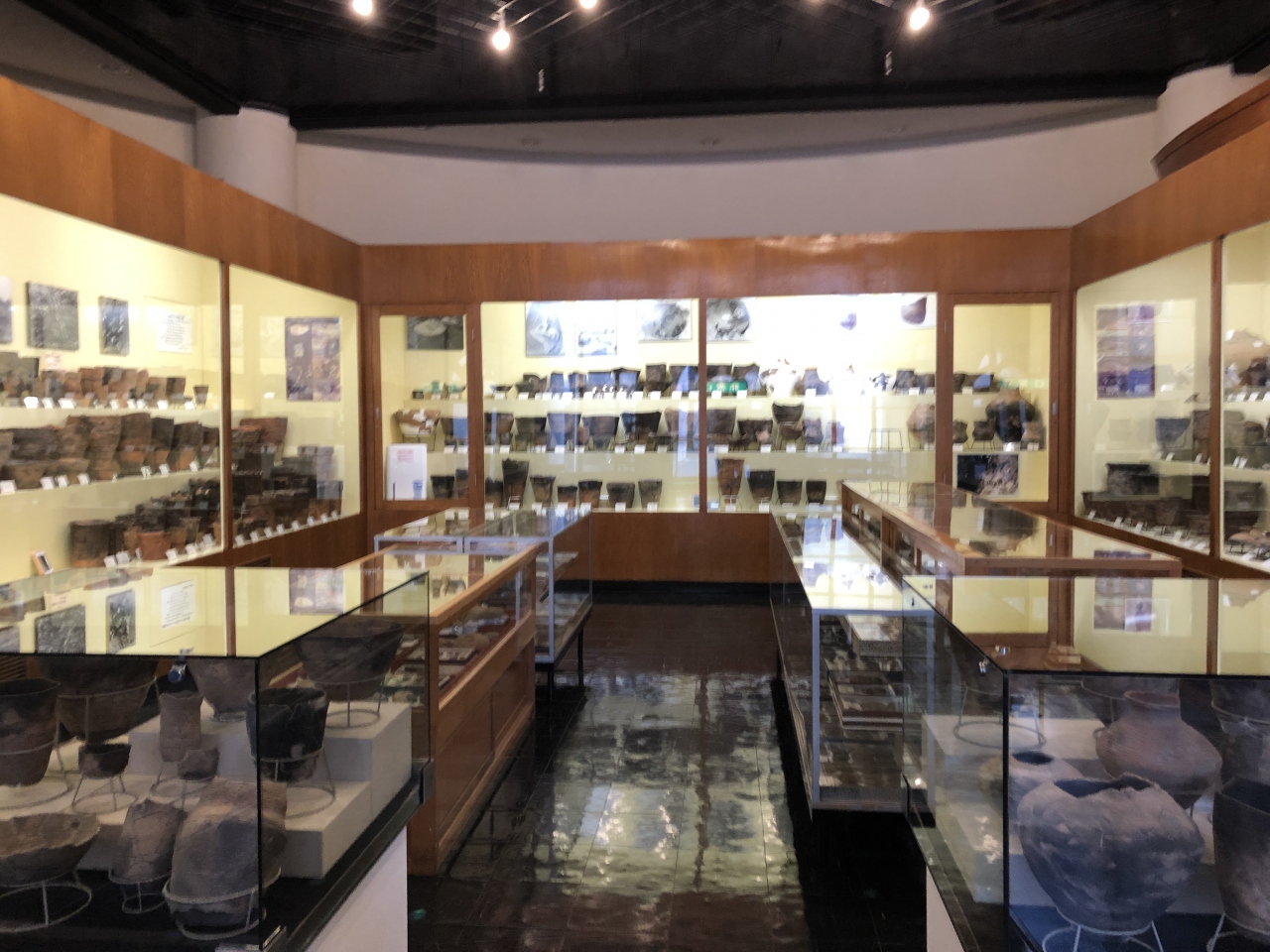 博物館を出たら目の前にあったのが埋蔵文化財調査センター。入るとわずか一室なれど、3方の壁の戸棚には土器がぎっしり。しかも今まで使われていたかのように、煤で黒くなっているのが、他では見ないので印象的だった。一気に縄文時代にタイムスリップしたかのようだった。
