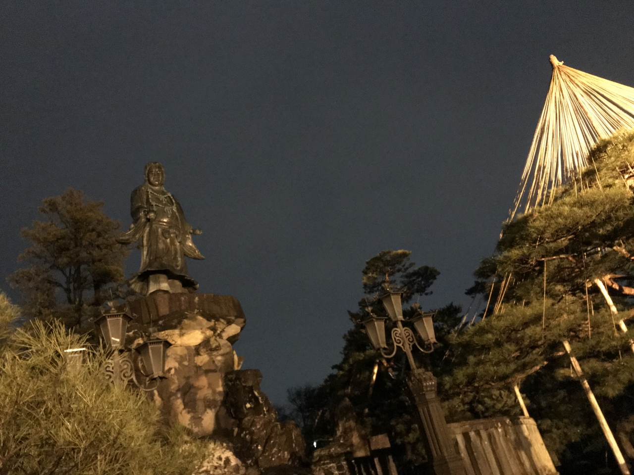 西南戦争ゆかりの銅像。郷土出身兵の慰霊碑だそうだ。夜間訪問だったので、遠目から見ると何の像だか全然わからなかったけど、近づくと日本武尊という解説版もあった。大きい銅像で見上げると迫力ある。兼六園の中に将兵の慰霊碑があるとは、ちょっと意外だった。