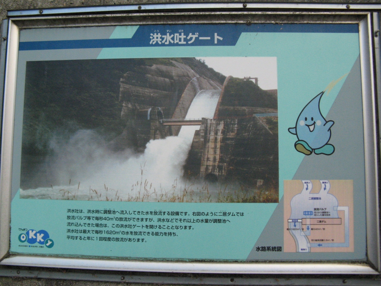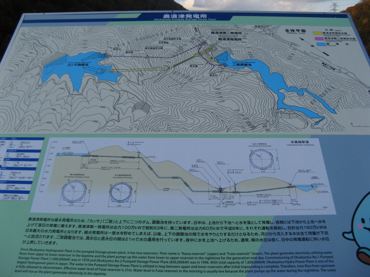 このダムから数km離れたところにカッサダムがあって、二居ダムが下池、カッサダムが上池となって、その落差470mを利用して、奥清津発電所で最大出力160万KWの揚水式発電をおこなうという珍しいダムです。