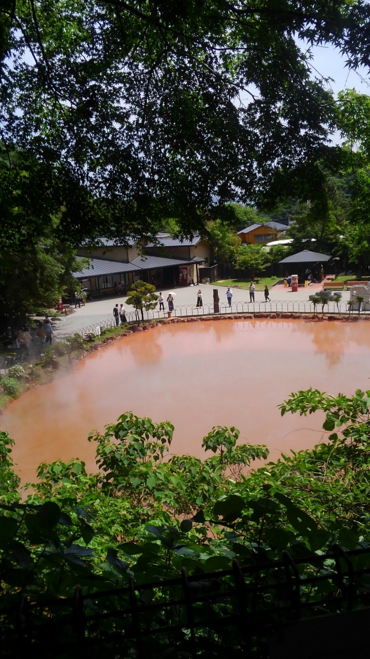 別府の地獄めぐりのひとつです。けっこう大きな赤い池地獄が少しのぼって見られます。平日の午前中に行きましたが、アジアの観光客で一杯でした。日本人客の方が少ない状態です。赤い池地獄は真っ赤ではありませんが迫力のある噴煙を上げています。