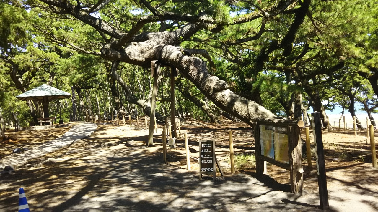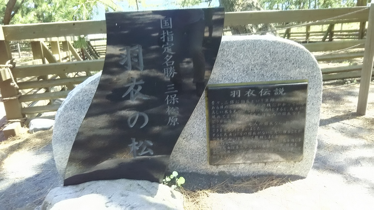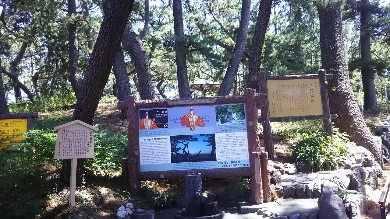 三保の松原の中にあるので、周りには樹形の見事な松が沢山あります。松も植物で歳を取りますから、羽衣の松も代替わりをしているようです。現在の松には囲いがされ、説明の標識もあります。それでも立派な松を見ながら羽衣の伝説を思い出すと、伝説なのですが体験できたような錯覚に浸れました。