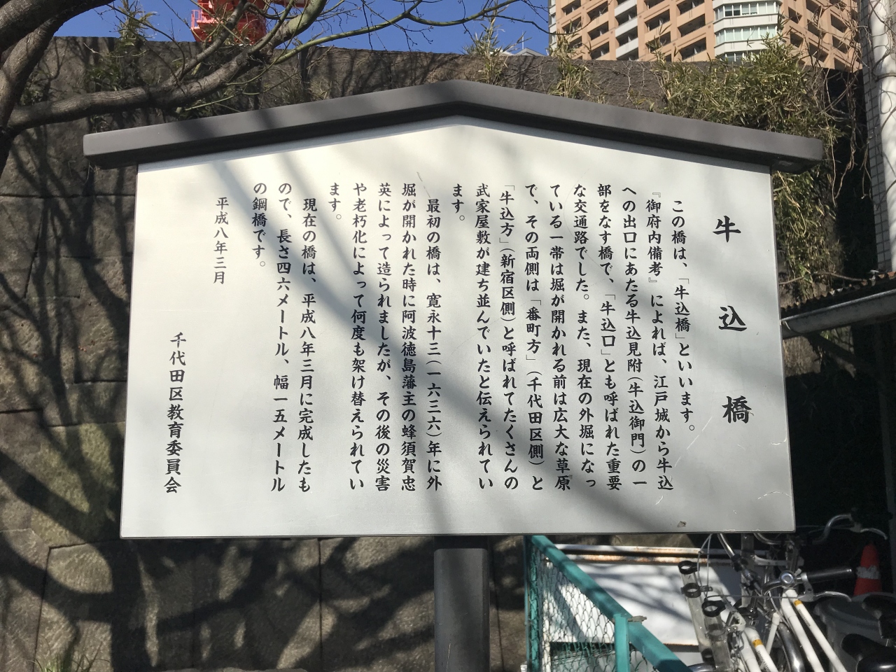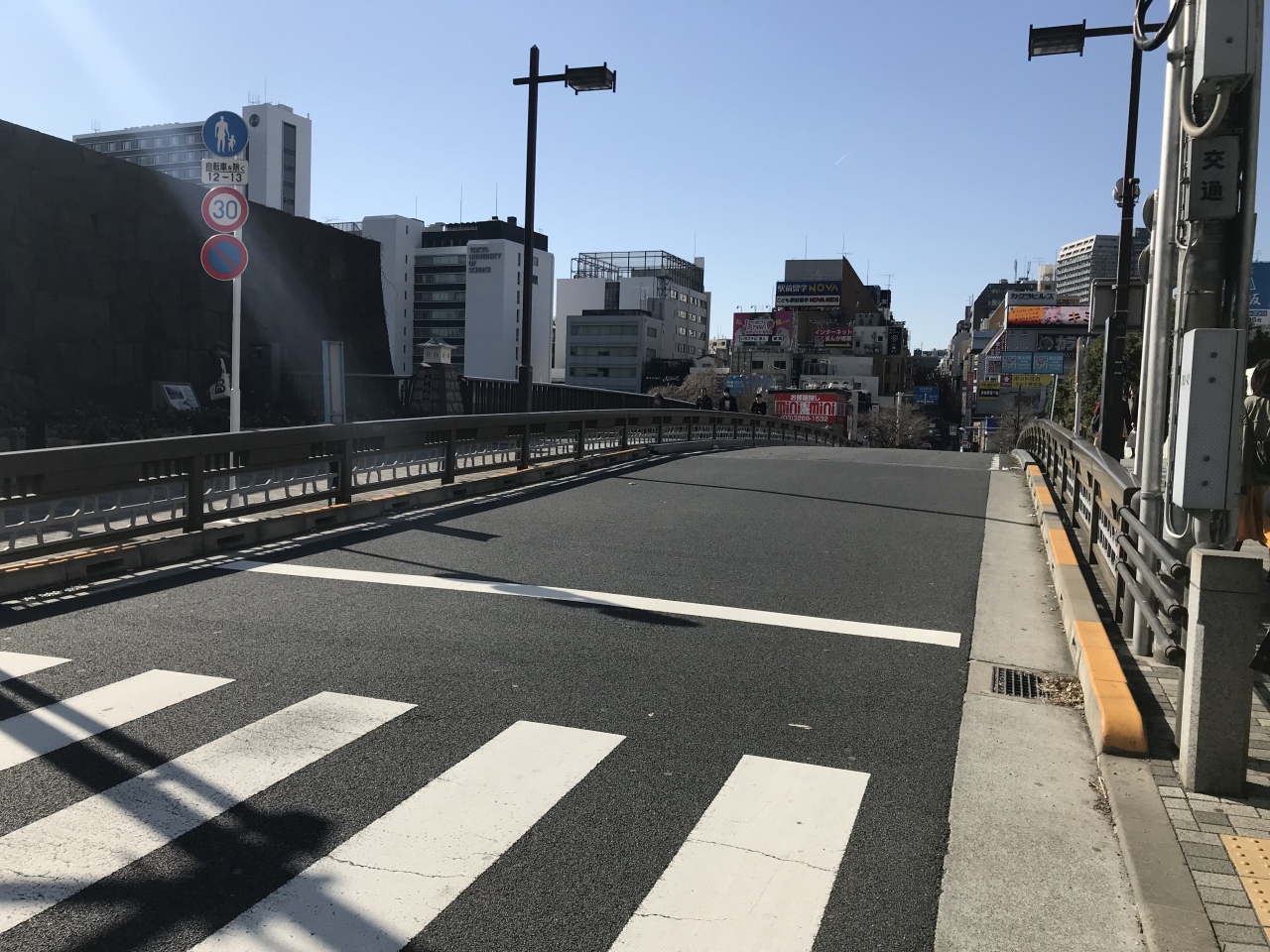 橋は新しく道路になっているけど、広い歩道が整備されていて歩きやすい。石垣が残っているので、なんとなく風情も感じられる。平日も休日も人通りが多く、活気がある橋です。橋の上からは電車も見える。昔、江戸城の外堀がここまであったなんて結構勉強になる。
