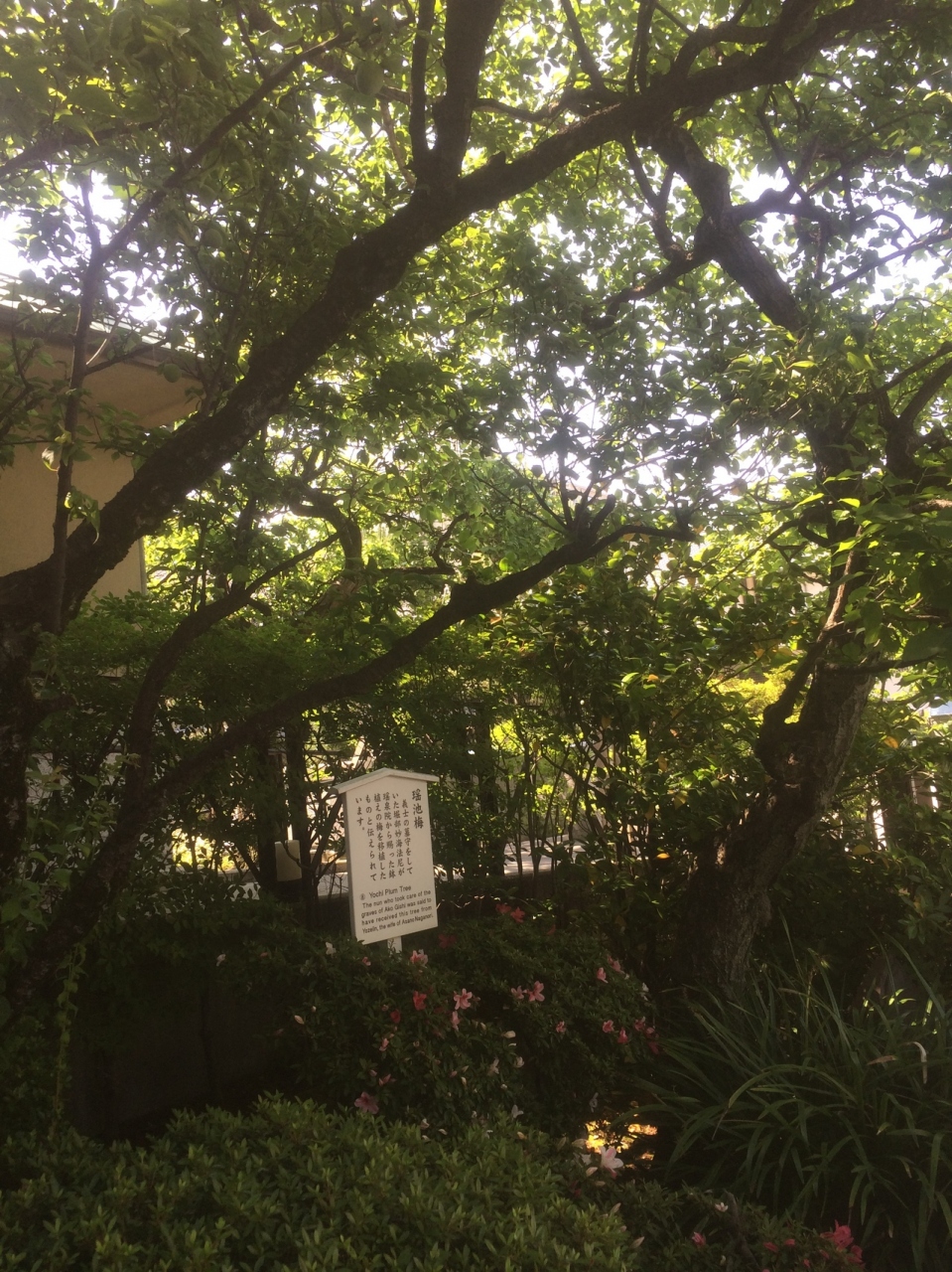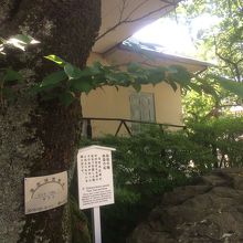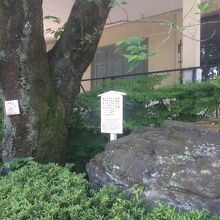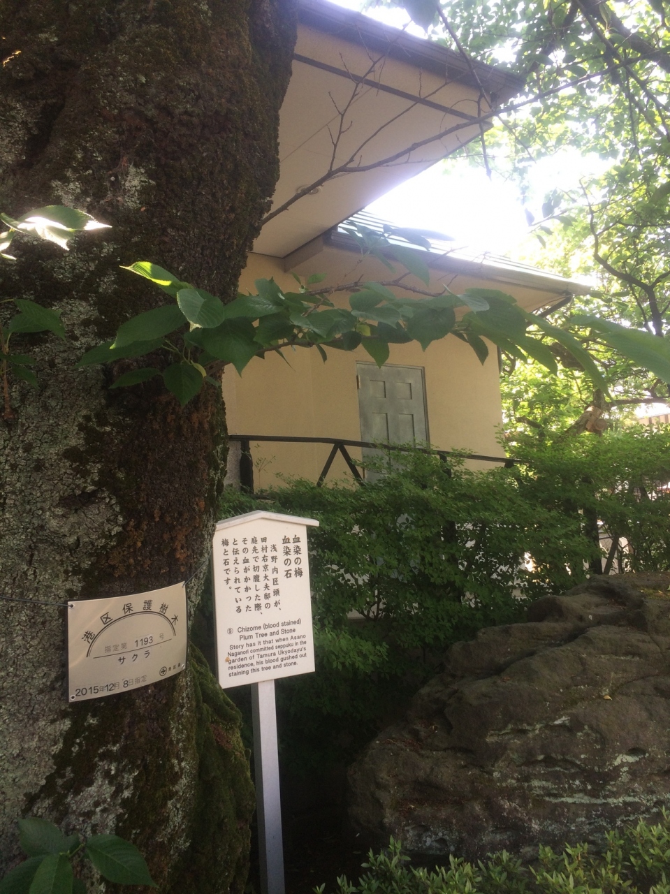 浅野内匠頭が庭先で切腹した際に石と梅に血が飛び散ったといわれるものです。石は大きく、木も大きな枝分かれしている木でした。前面には石で出来た囲いのようなものがあり、横は梅の木があり、境内の見どころのエリアの一つでした。