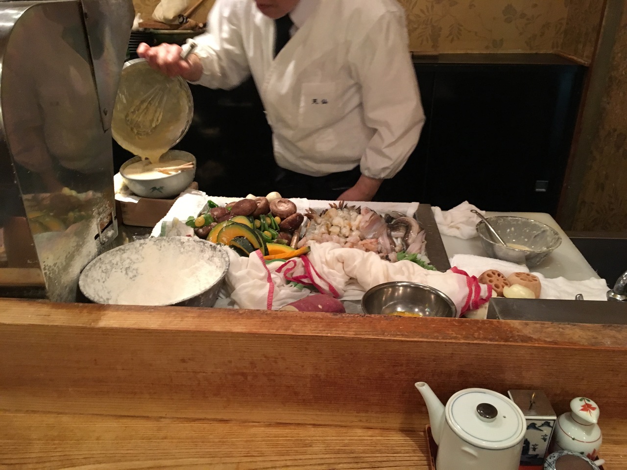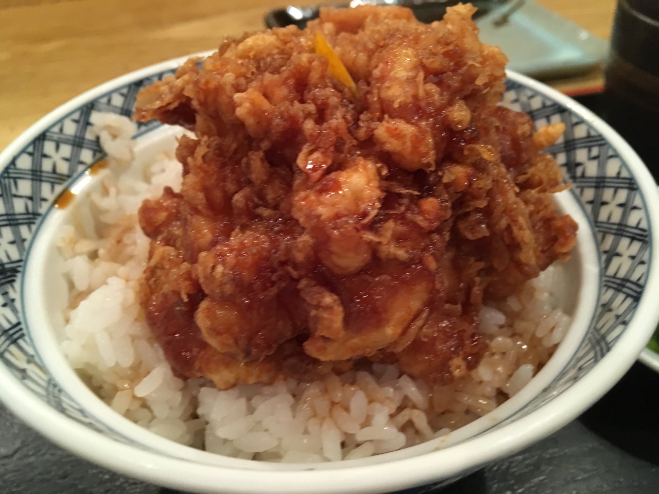 カウンター裏には食材が並び、店主が1人で天ぷらを揚げてゆく。よって、食事が提供されるまで少々時間がかかるのだが、店主の動作を見ているだけでワクワク感が高まるので(自分自身が時間に追われていないのであれば)その待ち時間も楽しい。さて、いよいよ自分のかき揚げの番になった。握り拳よりも大きいかき揚げが油から上がり、湯煎された天ぷらのタレに浸けられると「ジュワッ」と美味しそうな音を立てた。ご飯の上にそのかき揚げが載り、そこに柚子の皮が1片載って完成。