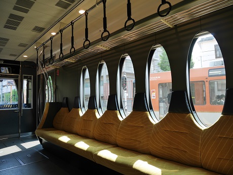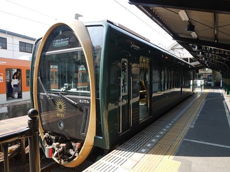 京都出町柳駅から比叡山に向かうのに利用するのが叡山電鉄で京阪電鉄からの乗り換えもスムーズ。叡山電鉄は叡山本線・鞍馬線の2路線運営する会社で比叡山に向かう「HIEI」は洒落た車体で窓は楕円形をし深緑に金色と配色も豪華な雰囲気を醸し出しています。