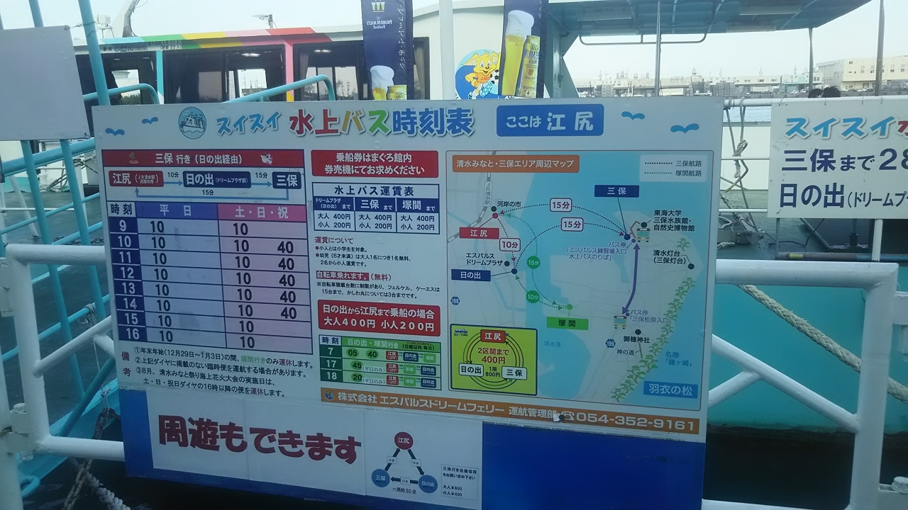 清水魚市場の河岸の市で買い物をして、建物を出たら船の乗り場がありました。ここから出発して三保の松原や水族館へ行くのに便利です。三保へは車でも行けるのですが、水上バスに乗ると海から富士山が見られるため、開放感のあふれる風景が楽しめます。