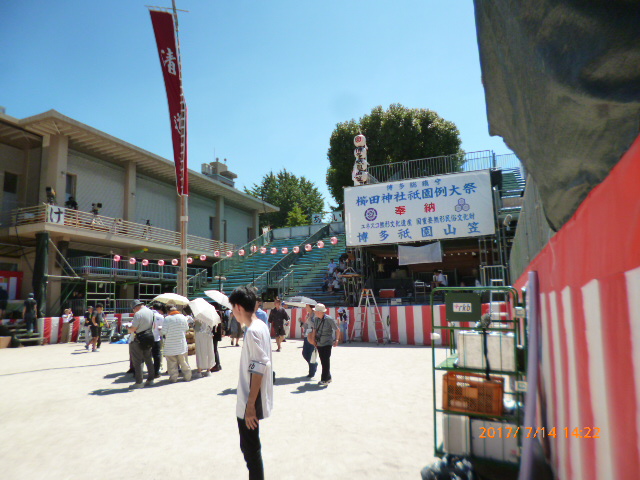 博多山笠のフィナーレを飾る「追い山」の前日に参拝しました。会場は最終日の準備に緊張感が漂っていました。桟敷席などの設営がされていたり、報道陣のカメラなどの設営など日ごろは見れない光景に満足な日となりました。